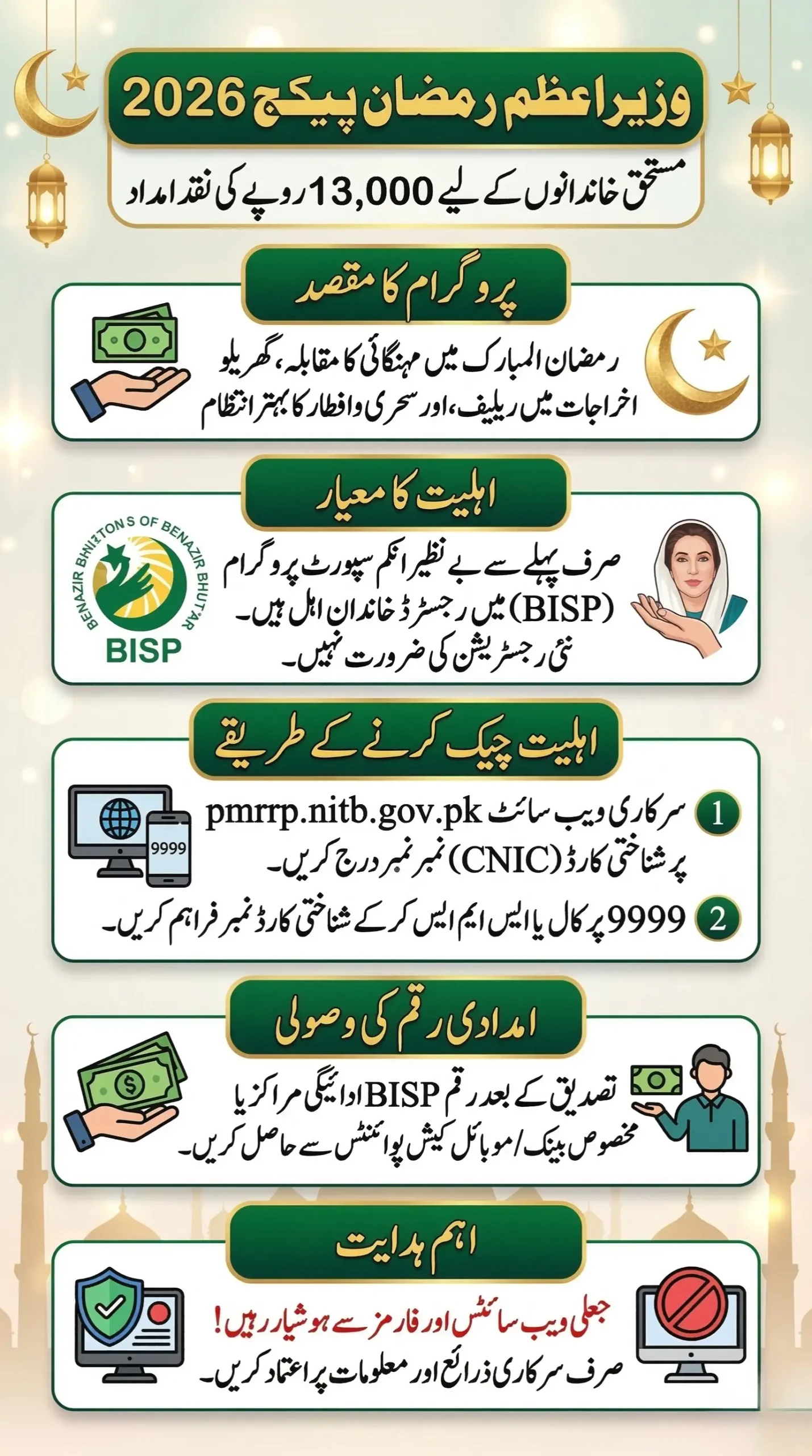 اس پروگرام کے لیے نئی رجسٹریشن کی ضرورت نہیں کیونکہ حکومت BISP اور نادرا کے ڈیٹا کے ذریعے مستحق افراد کو منتخب کر رہی ہے۔ آپ اپنا CNIC نمبر سرکاری پورٹل pmrrp.nitb.gov.pk پر درج کر کے یا 9999 سروس کے ذریعے اہلیت معلوم کر سکتے ہیں، اور اہل افراد کو رمضان میں براہ راست 13,000 روپے امداد دی جائے گی۔