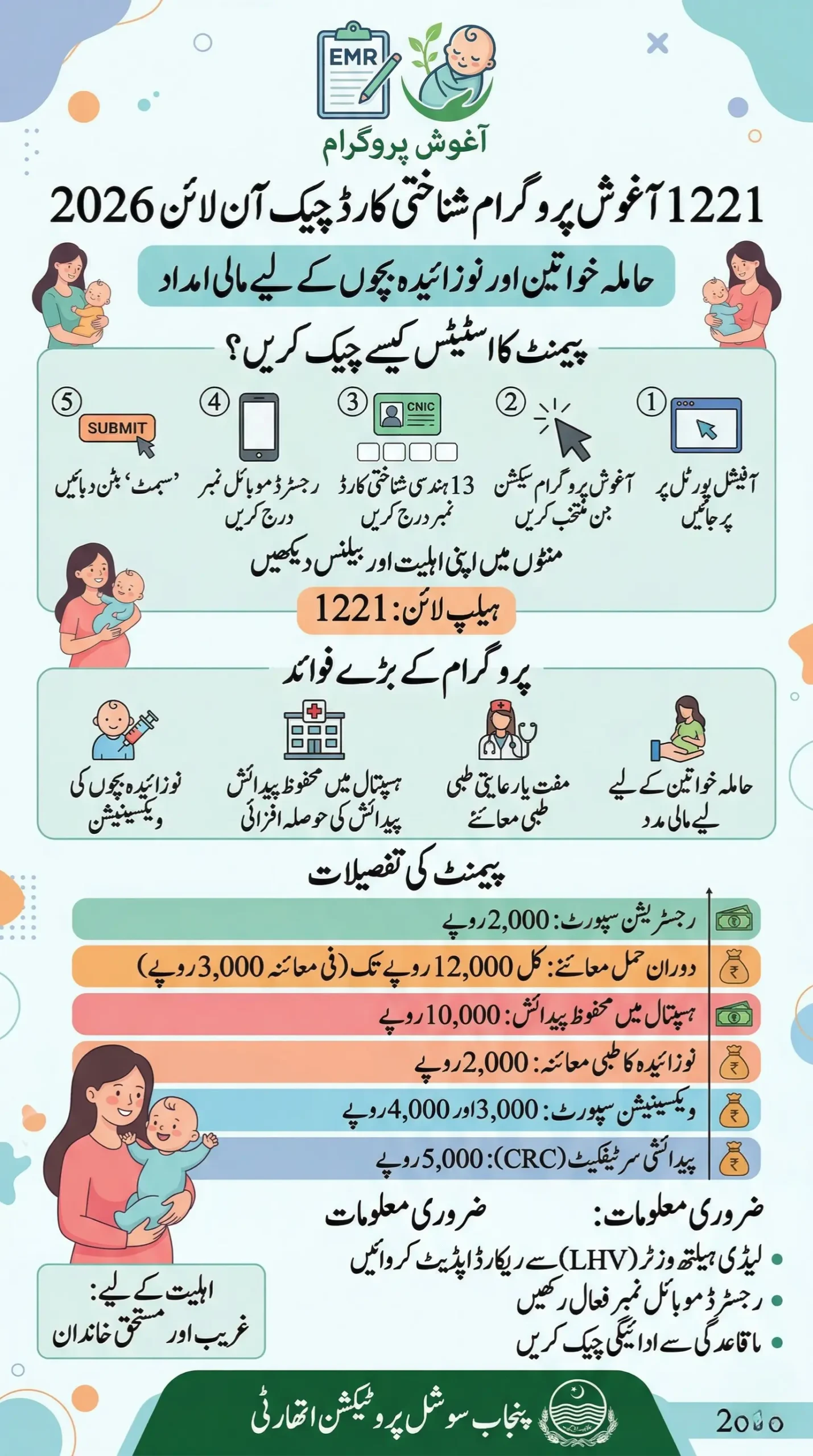 You can complete 1221 Aghosh Program online registration CNIC Punjab through government health centers where Lady Health Workers register pregnant women in the system.