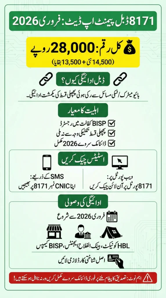 Under the 8171 Double Payment Update, the Government of Pakistan has announced a special installment of Rs. 28,000 for eligible families in February 2026. This payment is for those women who did not receive previous installment due to biometric or technical issues. Now, the two installments will be paid together for them, so that they can meet their basic expenses.