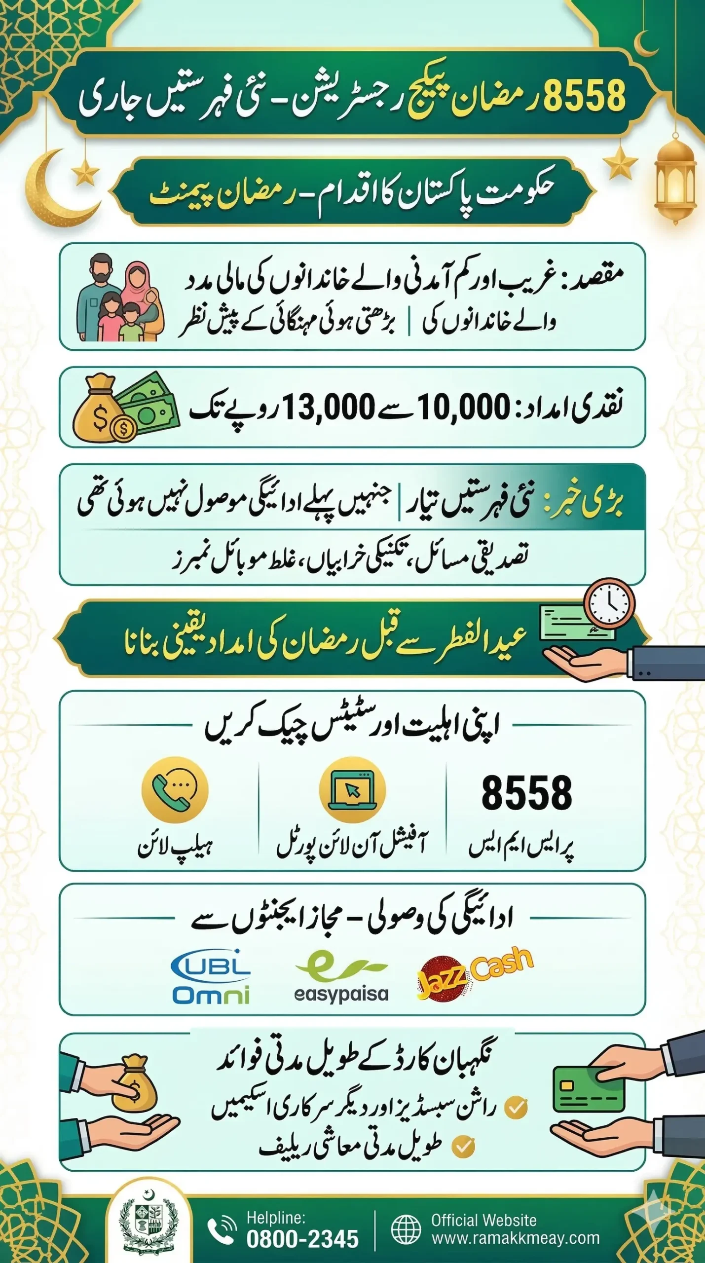 If you registered but have not yet received your payment, it is important to check your eligibility status regularly. Many applicants who were previously missed are now being included in the updated beneficiary lists under the 8558 Ramzan Package Registration system.