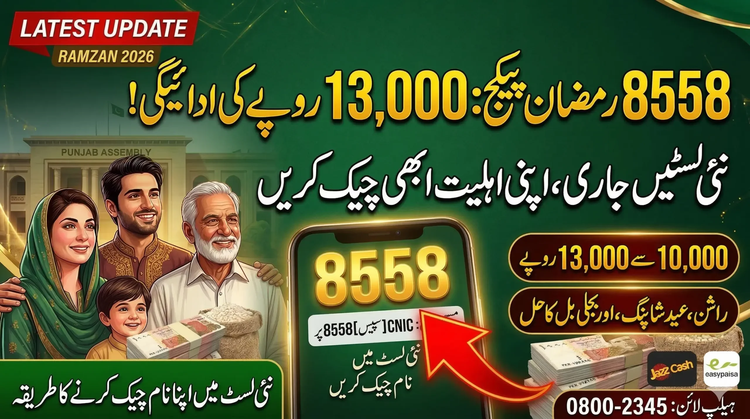 The 8558 Ramzan Package Registration program is providing financial relief to deserving families across Pakistan during the holy month. According to the latest update, the government has prepared new beneficiary lists for those who were eligible but did not receive their Rs.10,000 or Rs.13,000 Ramzan payment earlier.
