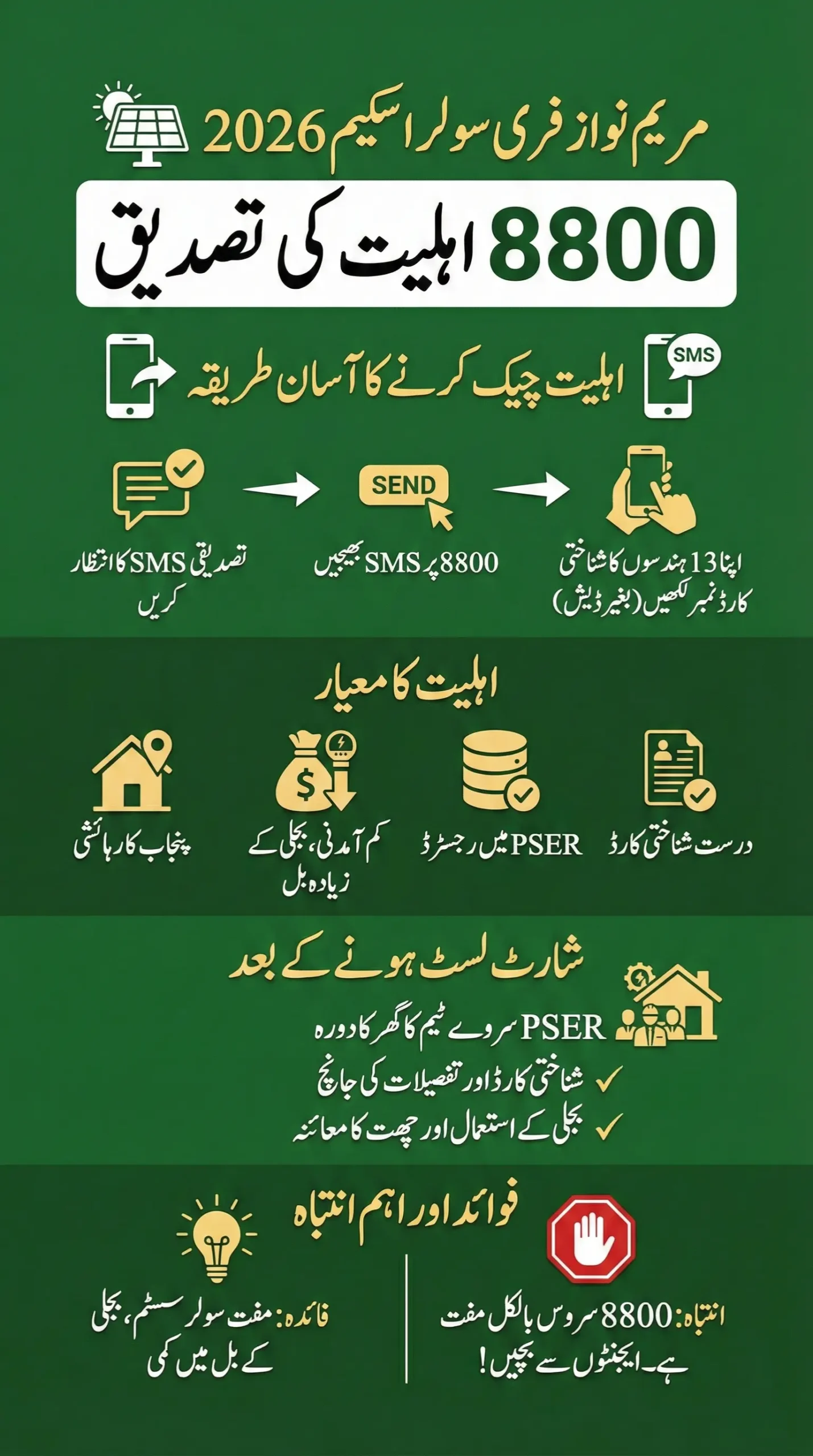 The 8800 CNIC Eligibility Verification for Maryam Nawaz Free Solar Scheme 2026 is a solid step toward energy justice in Punjab. With SMS checks, PSER surveys, and home verification, the system is built to be fair and fast.