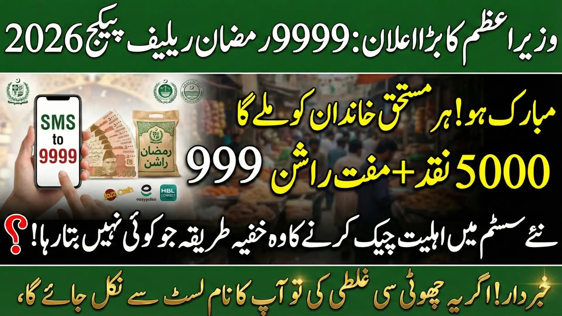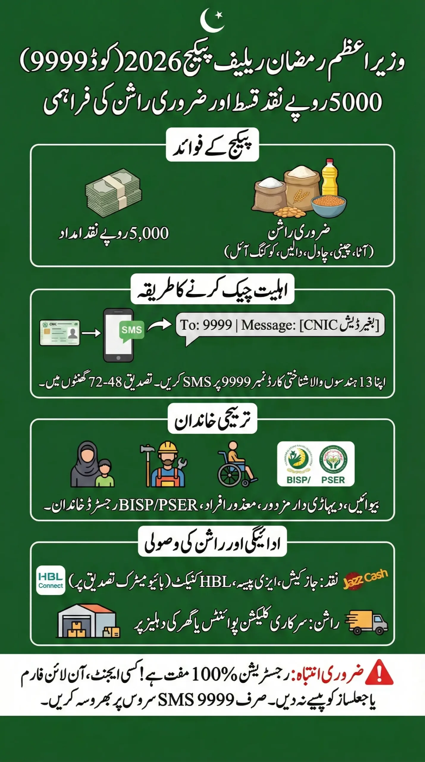 Eligibility can be checked easily by sending your 13-digit CNIC via SMS to 9999, without any fees or agents. Priority is given to widows, daily wage earners, disabled persons, and BISP or PSER-registered families. Payments are made through JazzCash, EasyPaisa, or HBL Connect, ensuring a fast, transparent, and dignified relief process for deserving families.