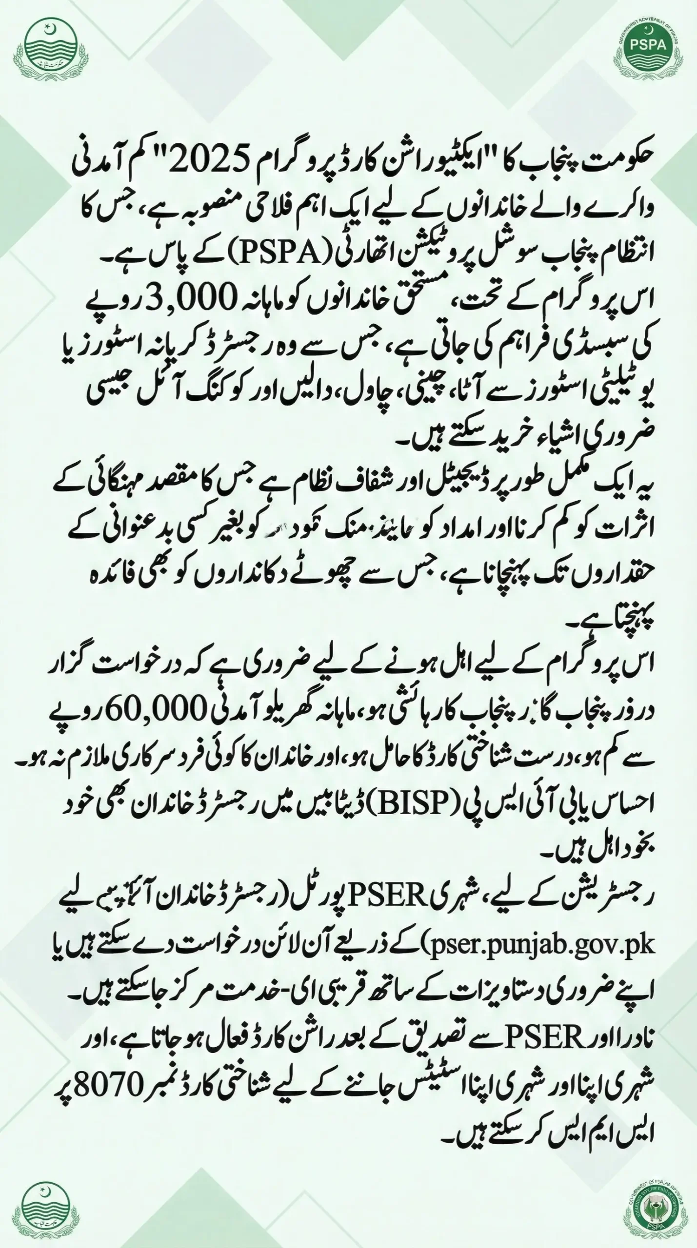 Families can apply online via the PSER portal or offline at e-Khidmat Markaz, and activation is confirmed through NADRA and PSER databases. The program is fully digital, transparent, and ensures aid reaches deserving families while supporting small shopkeepers. Check your activation status via 8171 SMS or online to start receiving relief immediately.