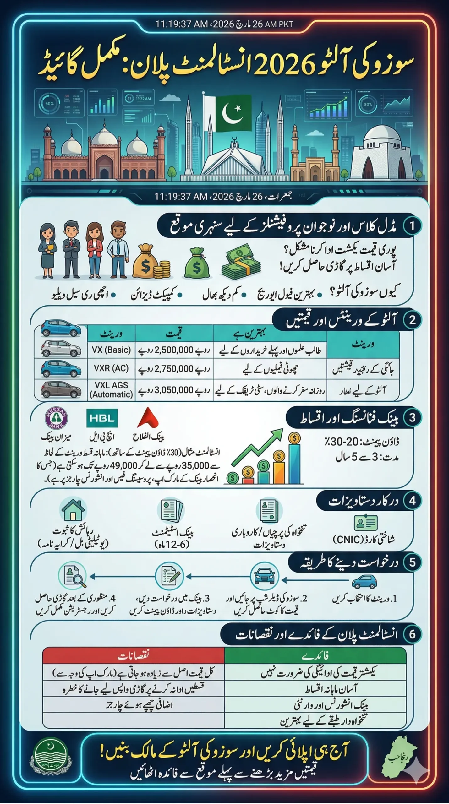 The Suzuki Alto Installment Plan in 2026 has become one of the most searched topics for car buyers in Pakistan, especially among middle class families and young professionals who cannot afford to pay the full price of a vehicle upfront. With rising car prices and a tough economy, installment options offered by banks and leasing companies have made it easier for people to own a reliable vehicle like the Suzuki Alto without putting too much financial pressure on their monthly budget.