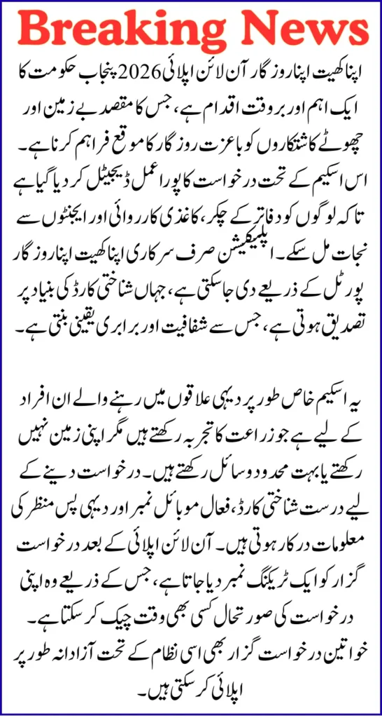 This article explains Apna Khet Apna Rozgar Online Apply 2026 in a clear and practical way, guiding landless and small farmers on how to apply through the official digital portal. It covers the purpose of the scheme, who is eligible, what information is required, and how the CNIC-based online system ensures transparency.