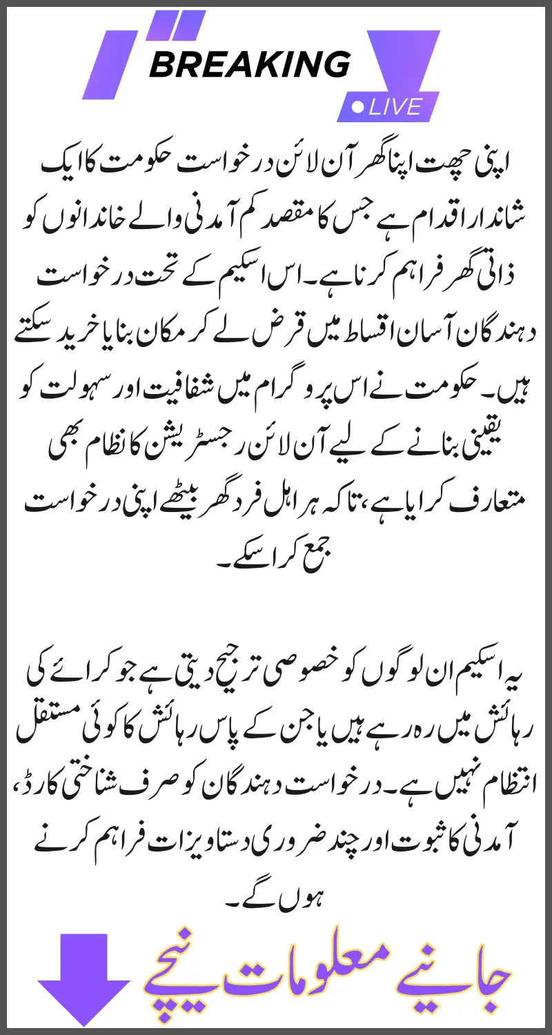 Apni Chhat Apna Ghar Application Online is a wonderful initiative of the government aimed at providing a personal home to low-income families. Under this scheme, applicants can build or purchase a house by taking a loan in easy installments. The government has also introduced an online registration system to ensure transparency and convenience in this program, so that every eligible person can submit their application sitting at home.