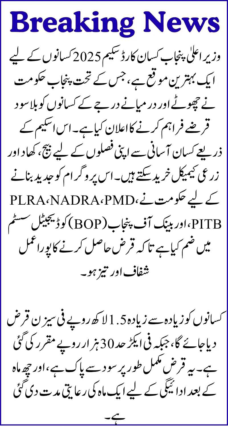 CM Punjab Kisan Card Scheme 2025 is a great opportunity for farmers, under which the Punjab government has announced to provide interest-free loans to small and medium farmers. Through this scheme, farmers can easily purchase seeds, fertilizer,s and agrochemicals for their crops. To modernize this program, the government has integrated PLRA, NADRA, PMD, PITB, and Bank of Punjab (BOP) into a digital system so that the entire process of getting a loan is transparent and fast.