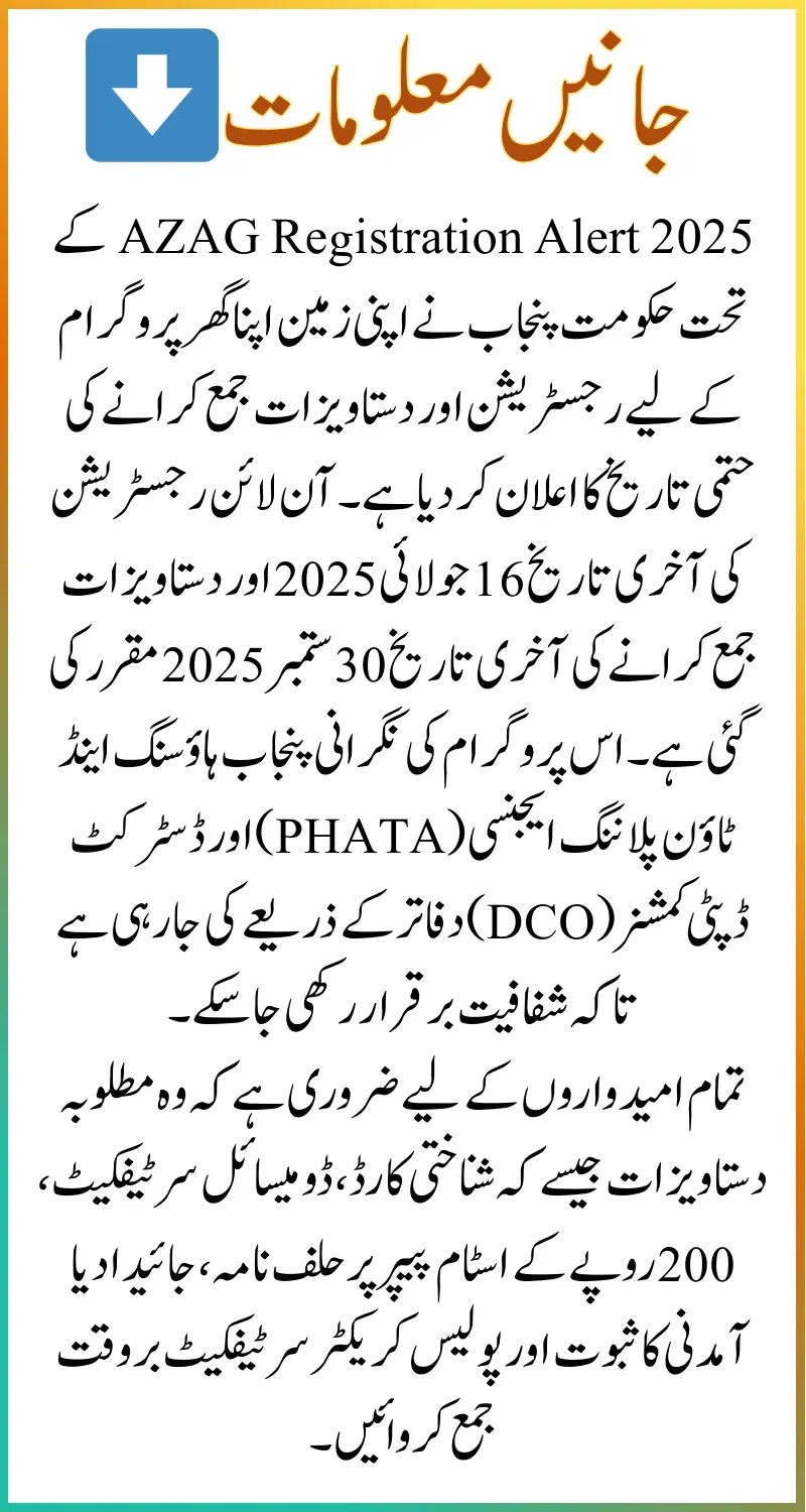 The AZAG Registration Alert 2025 has been officially announced, and applicants of the Apni Zameen Apna Ghar Program (AZAG Program) must pay close attention to upcoming deadlines. The Government of Punjab, in collaboration with the Punjab Housing and Town Planning Agency (PHATA), has set clear dates for online registration and document submission. This initiative aims to provide affordable housing to thousands of deserving families across Punjab. To ensure transparency, the entire process is monitored by the Scrutiny Committee through District Deputy Commissioner (DCO) Offices and PHATA Field Offices.