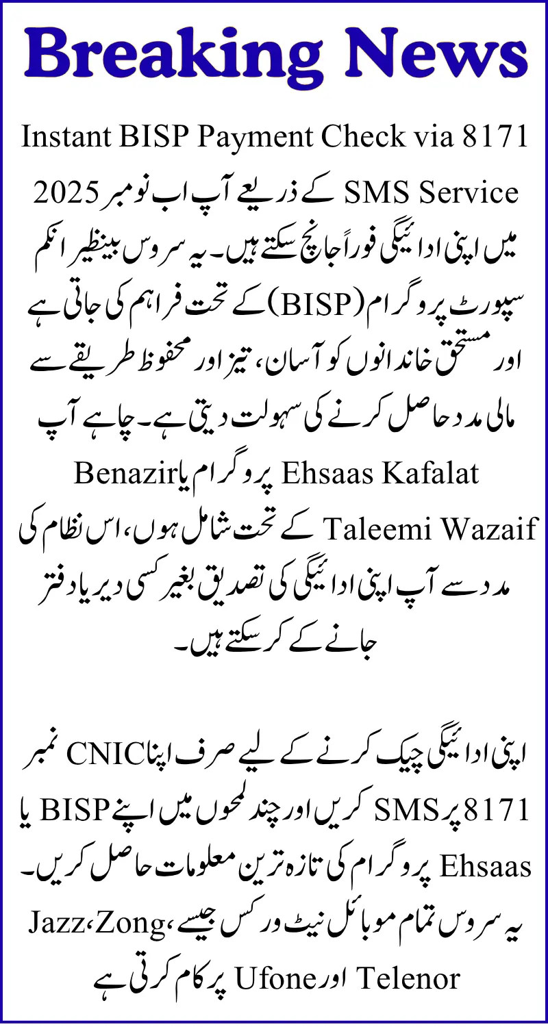 Also Read: BISP 8171 Payment SMS Delay – Latest November 2025 Update
