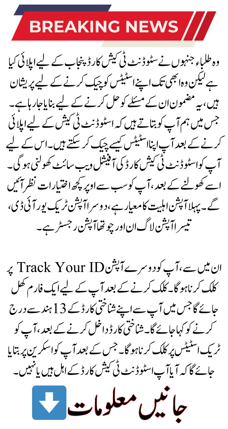 Out of these, you have to click on the second option Track Your ID. After clicking, a form will open for you in which you will be asked to enter the 13 digits of your ID card. After entering the ID card, you have to click on Track Status. After which you will be told on the screen whether you are eligible for the Student T-Cash Card or not. The Student T-Cash Card will be given to those students who are studying in any institute, technical, school or madrasa of Punjab and they should have a domicile of Punjab.