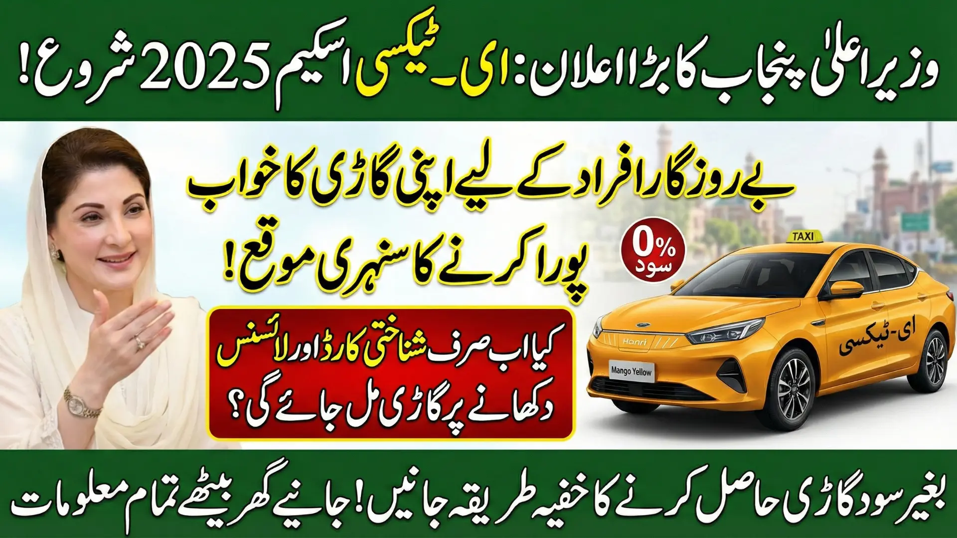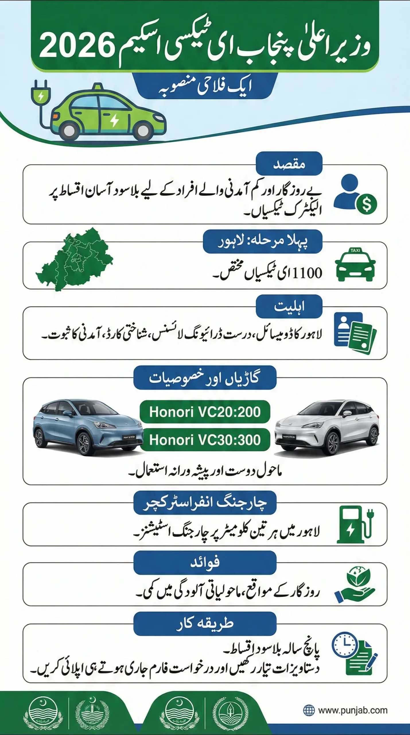 The CM Punjab E Taxi Scheme 2026 Apply Online offers unemployed and low-income citizens a chance to own electric taxis on interest-free five-year installments. In the first phase, 1,100 e-taxis will be provided in Lahore, with expansion planned across Punjab. Eligible applicants must have a Lahore domicile, valid CNIC, Punjab driving license, and income proof.