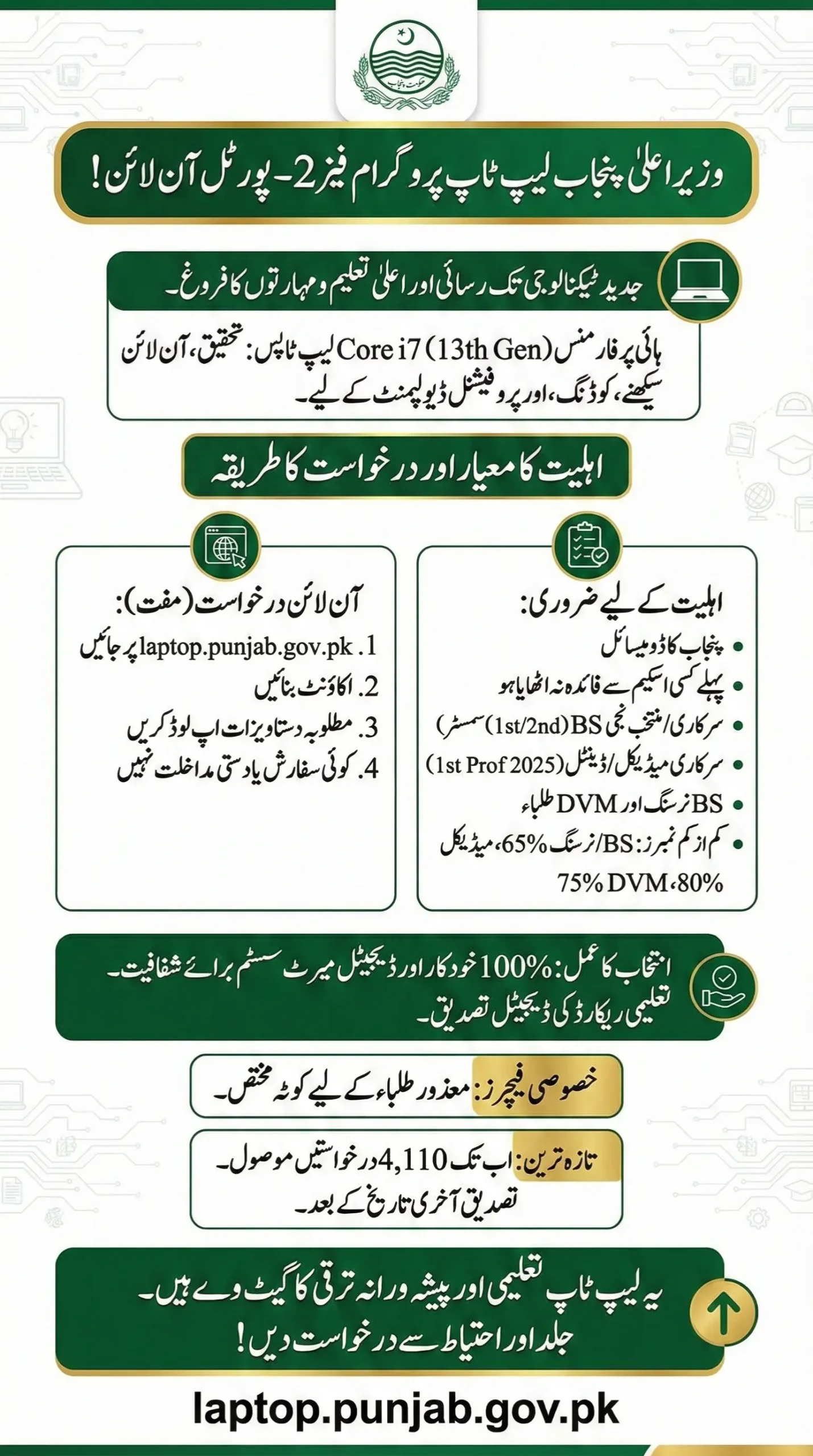 The program provides high-performance laptops to help students in research, online learning, coding, design, and professional development. Selection is strictly merit-based and fully digital, ensuring transparency and fairness. CM Laptop Phase 2 reflects the government’s commitment to digital inclusion, academic excellence, and preparing Punjab’s youth for a competitive future.