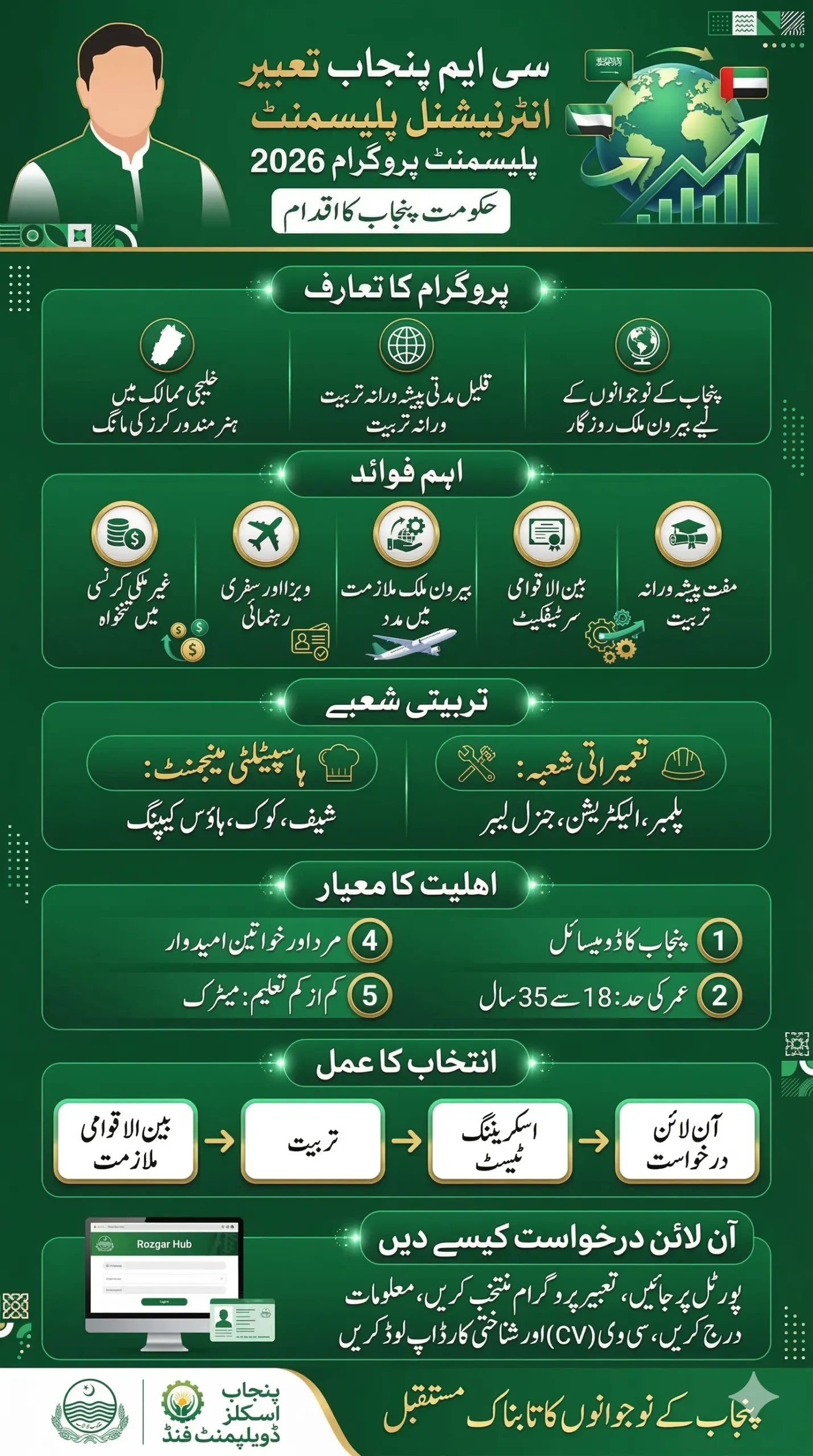 The CM Punjab Tabeer Program 2026 could become an important step for young people in Punjab who want to build a career abroad. With short training programs, international certification, and overseas job opportunities, the scheme offers a realistic pathway for skilled and semi-skilled workers to enter global job markets.