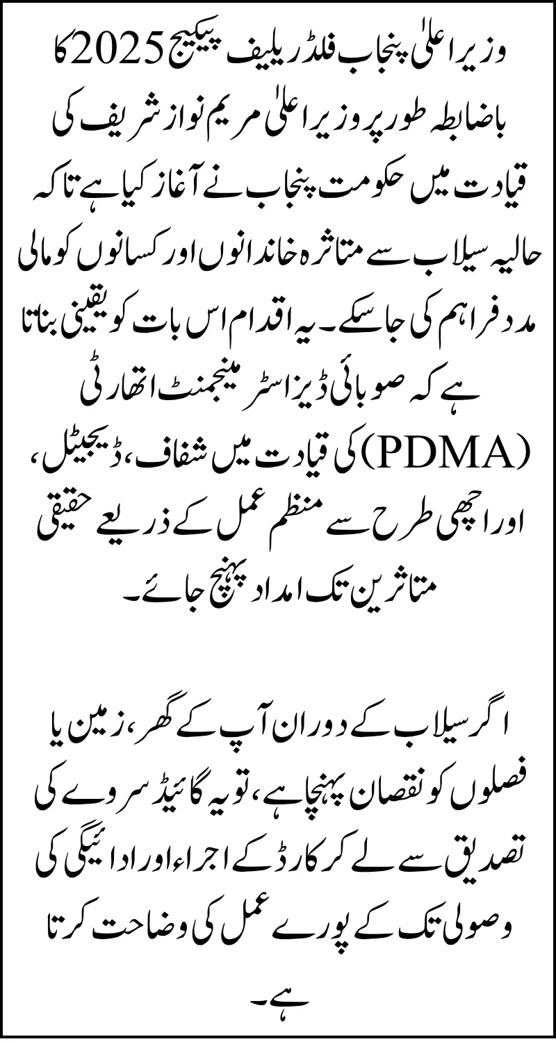 The CM Punjab Flood Relief Package 2025 has been officially launched by the Government of Punjab under the leadership of Chief Minister Maryam Nawaz Sharif to provide financial support to families and farmers affected by recent floods. This initiative ensures that relief reaches genuine victims through a transparent, digital, and well-organized process led by the Provincial Disaster Management Authority (PDMA).