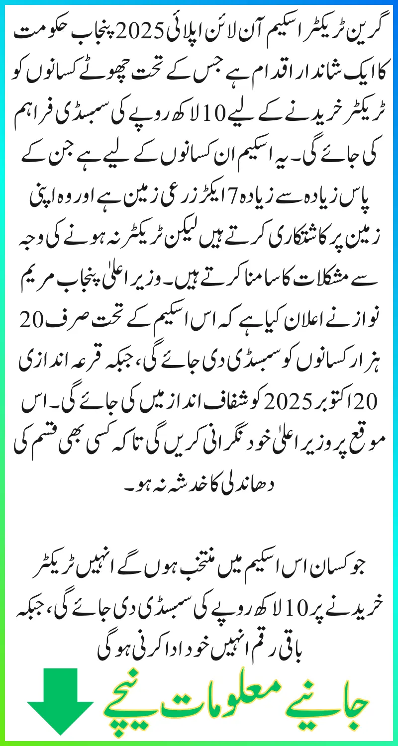 Green Tractor Scheme Online Apply 2025 is a wonderful initiative of the Punjab government under which a subsidy of Rs 1 million will be provided to small farmers to buy a tractor. This scheme is for those farmers who have a maximum of 7 acres of agricultural land and cultivate their land but face difficulties due to lack of a tractor. Punjab Chief Minister Maryam Nawaz has announced that only 20,000 farmers will be given subsidy under this scheme while the draw will be held in a transparent manner on October 20, 2025. The Chief Minister herself will supervise this occasion so that there is no fear of any kind of rigging.