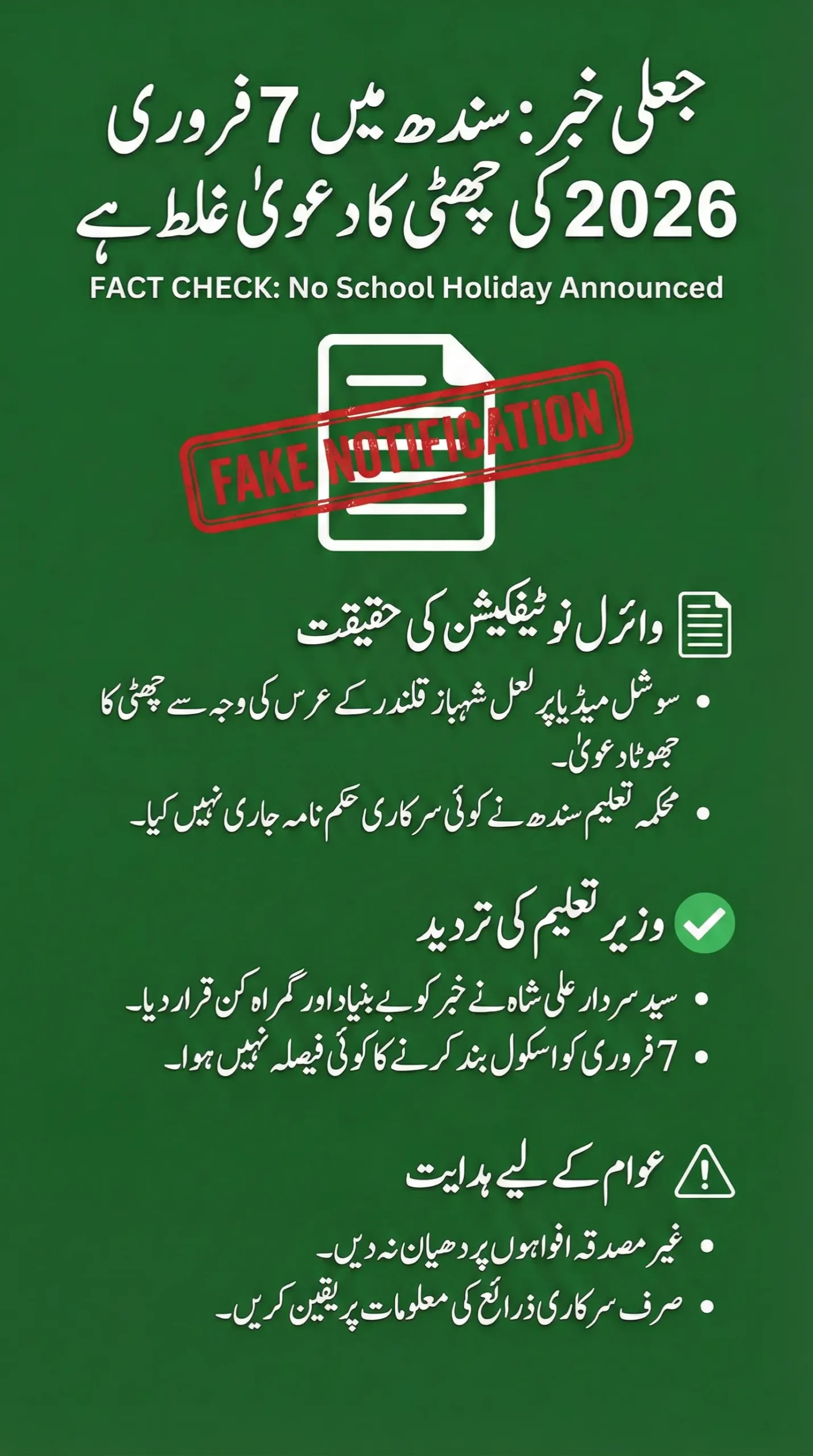 The claim that Sindh has announced a province-wide school holiday for February 7, 2026, is false. The Sindh Education Minister has clearly stated that the notification circulating on social media is fake, and no such decision has been taken by the department.