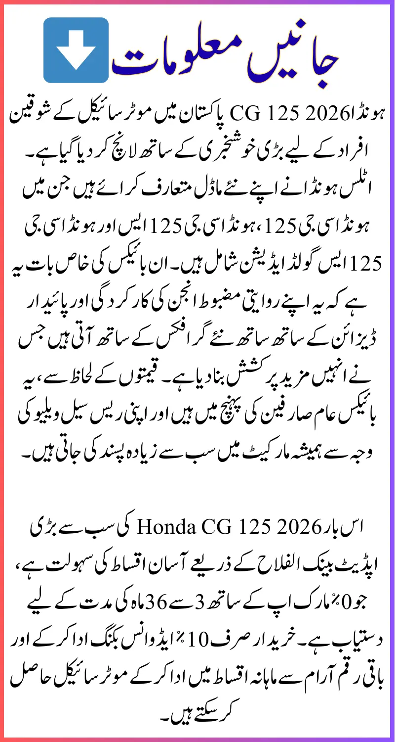 This time, the biggest update of Honda CG 125 2026 is the easy installment facility through Bank Alfalah, which is available for a period of 3 to 36 months with 0% markup. Buyers can get the bike by paying only 10% advance booking and paying the remaining amount in comfortable monthly installments. This facility is especially beneficial for youth, students, the salaried class, and small businessmen who cannot afford to pay a large amount at once.