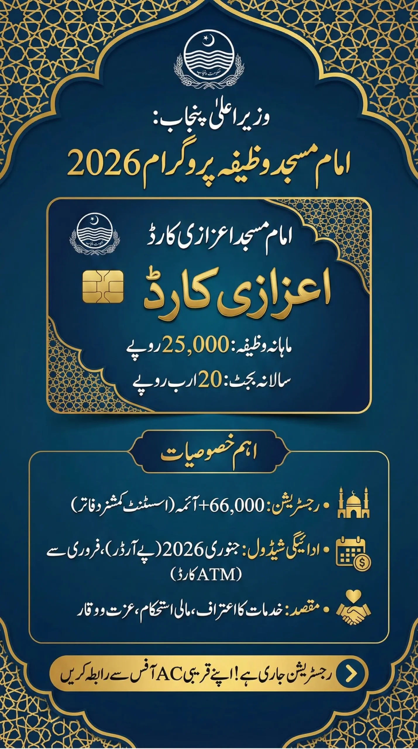 Over 66,000 Imams have already registered via Assistant Commissioner offices. Payments will be made through pay orders in January 2026, followed by a special Honorary Card from February linked to ATM systems. This initiative promises financial stability, dignity, and long-overdue recognition for Imams serving communities throughout Punjab.
