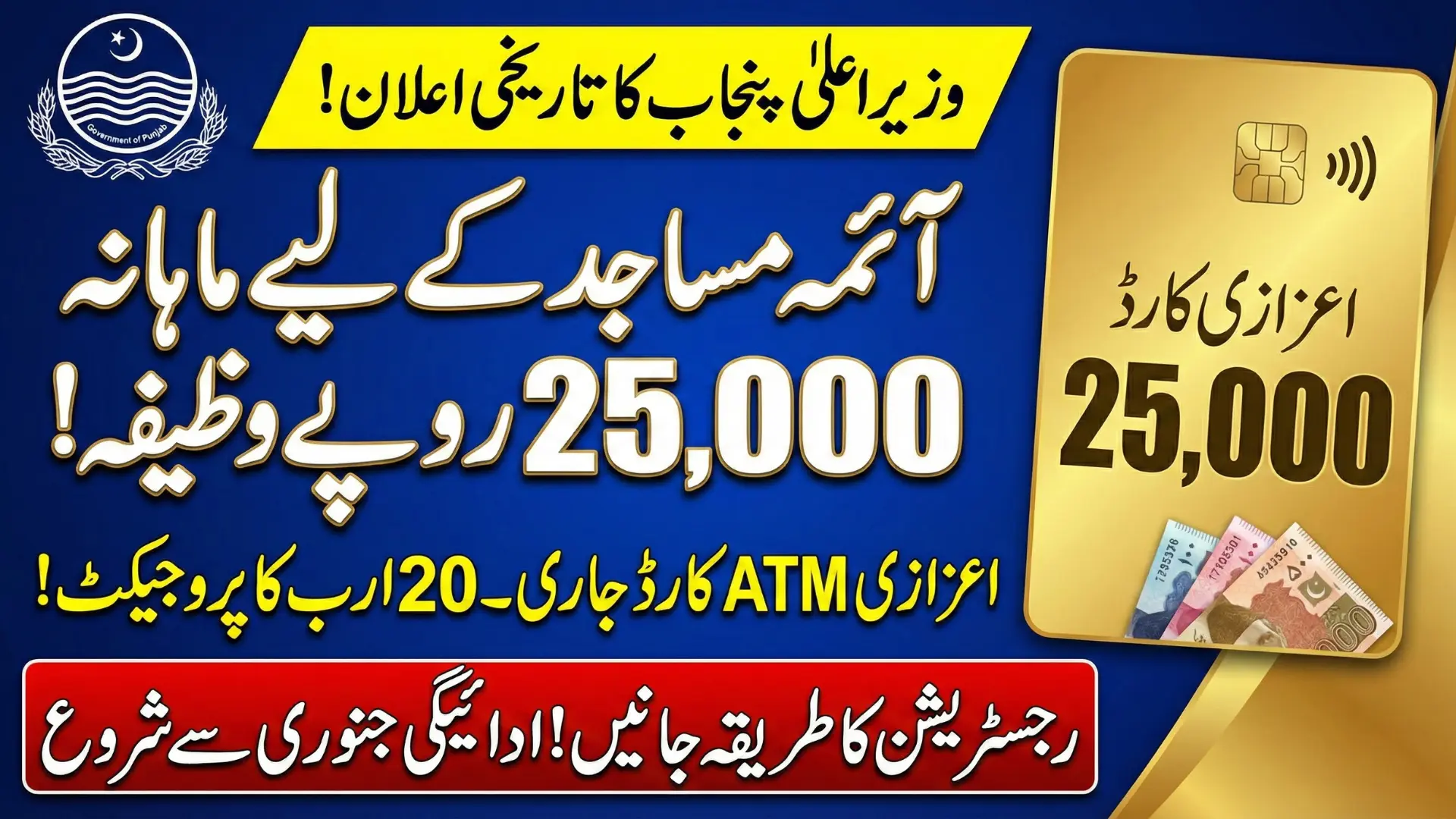 The Punjab Chief Minister Issued Honorary Card for Imam Masjid Wazifa Program 2026, marking a historic welfare step for mosque Imams across the province. Under this program, all registered Imams will receive a monthly honorarium of Rs 25,000, funded through a Rs 20 billion annual budget.