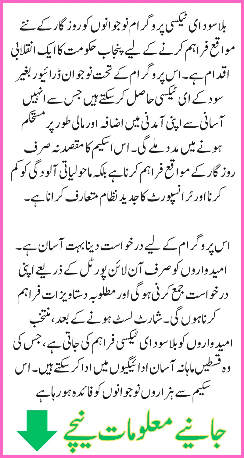 The Interest-Free E-Taxi Program is a revolutionary initiative of the Punjab government to provide new employment opportunities to the youth. Under this program, young drivers can get e-taxi without interest, which will help them easily increase their income and become financially stable. The scheme aims not only to provide employment opportunities but also to reduce environmental pollution and introduce a modern transport system.