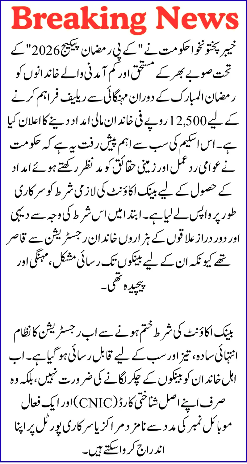 The KP Ramadan Package 2026 is bringing real relief to deserving families across Khyber Pakhtunkhwa with Rs 12,500 in direct financial assistance. Initially, a mandatory bank account requirement was blocking thousands of rural and low-income households from registering.