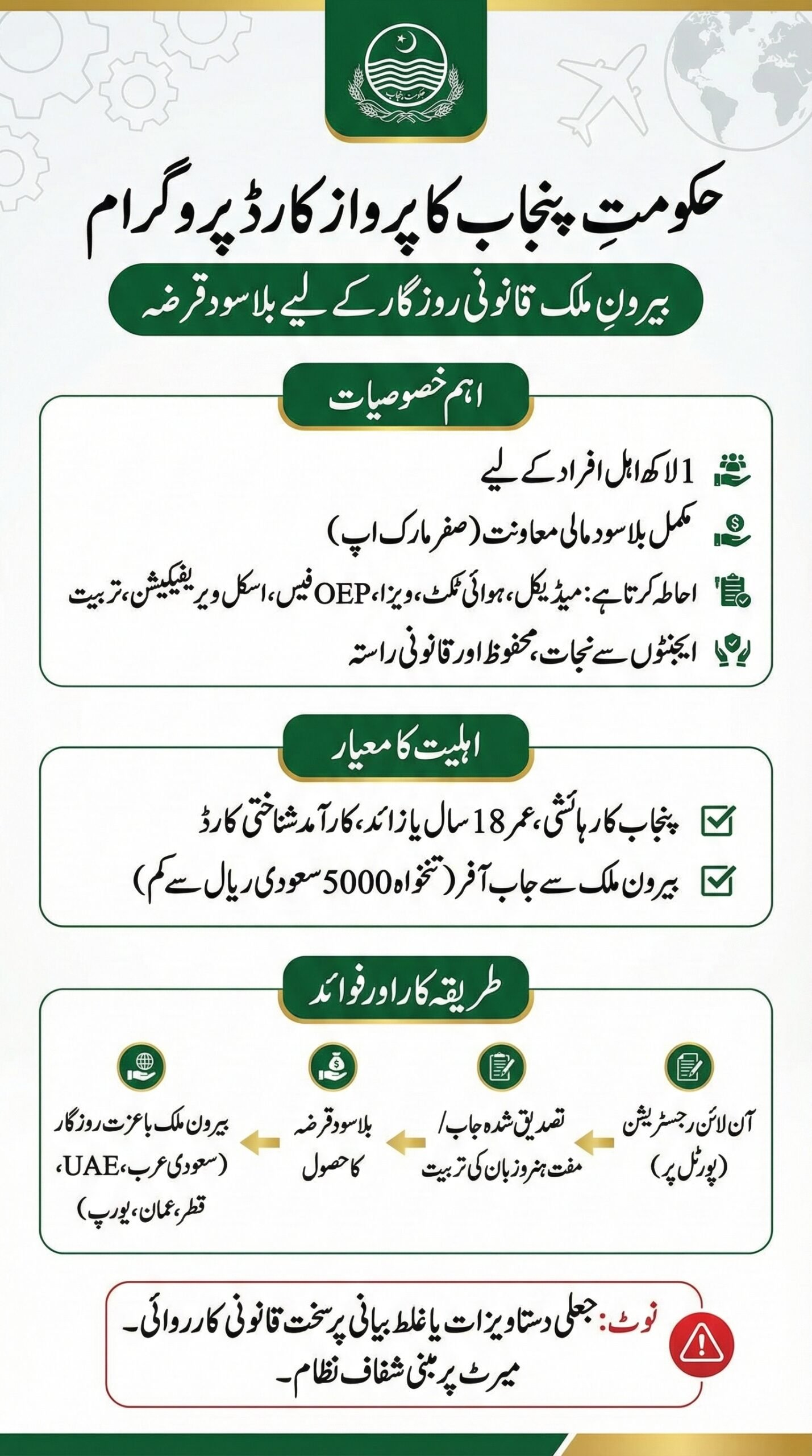 The interest-free loan under the Parwaz Card Program is a major relief for 100,000 eligible people in Punjab who want to work abroad legally. Launched by the Punjab Government under Maryam Nawaz, the scheme covers medical tests, air tickets, skill verification, OEP charges, and pre-departure training all without interest.