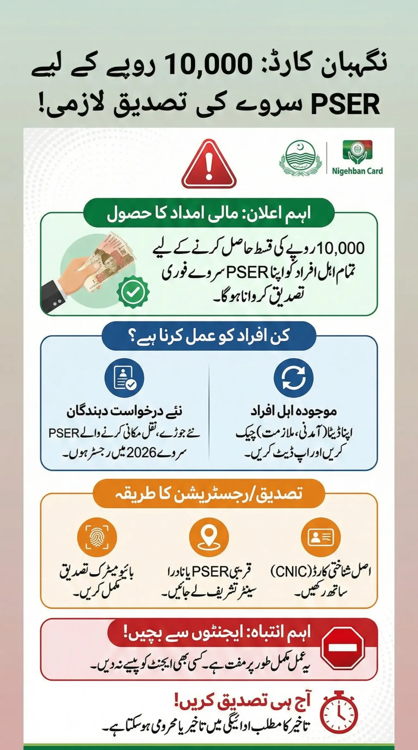 The message is clear: Nigehban Card eligible people must verify their PSER survey to get Rs 10,000. This is not just another government announcement it is a practical step that decides whether support reaches your home or not.
