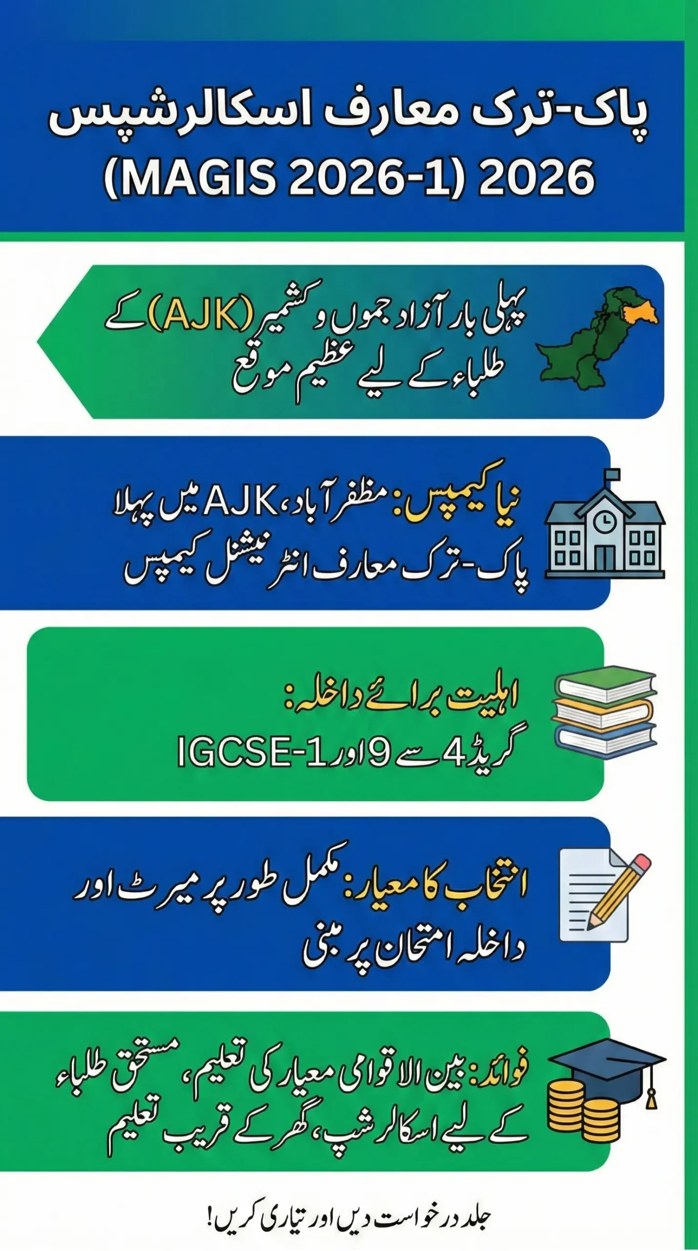 Pak-Turk Maarif Scholarships 2026 have been officially announced, bringing a major education opportunity for students of Azad Jammu and Kashmir for the first time. Under the MAGIS 2026-1 entrance exam, talented students from AJK and across Pakistan can apply for admissions with merit-based scholarships in Grades 4 to 9 and IGCSE-1.