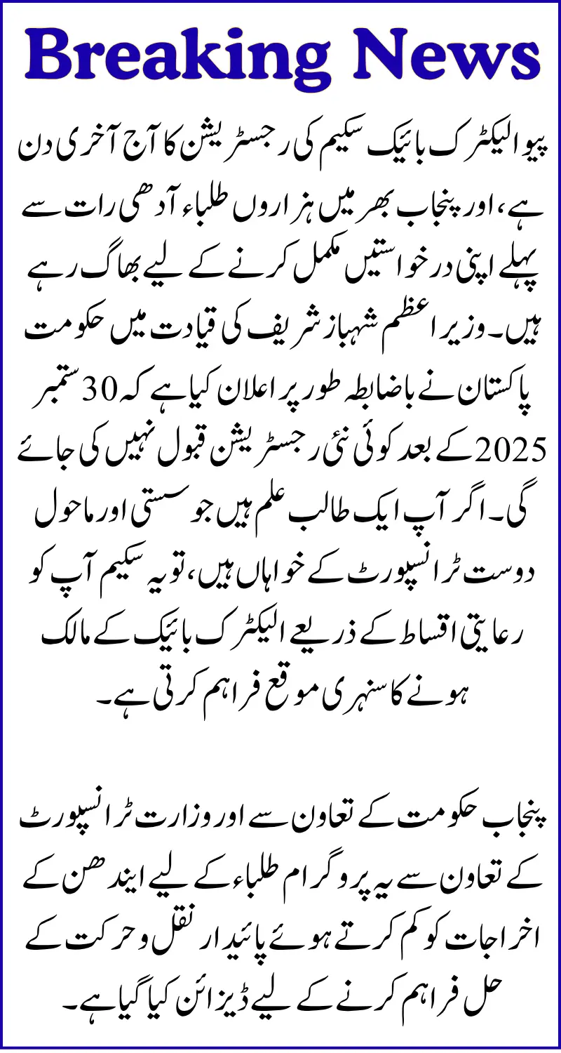 Today is Pave Electric Bike Scheme Registration Last Day, and students must complete their applications before midnight. The program, supported by the Punjab Government and Ministry of Transport, offers a life-changing opportunity for students to own an electric bike at subsidized rates and interest-free installments.