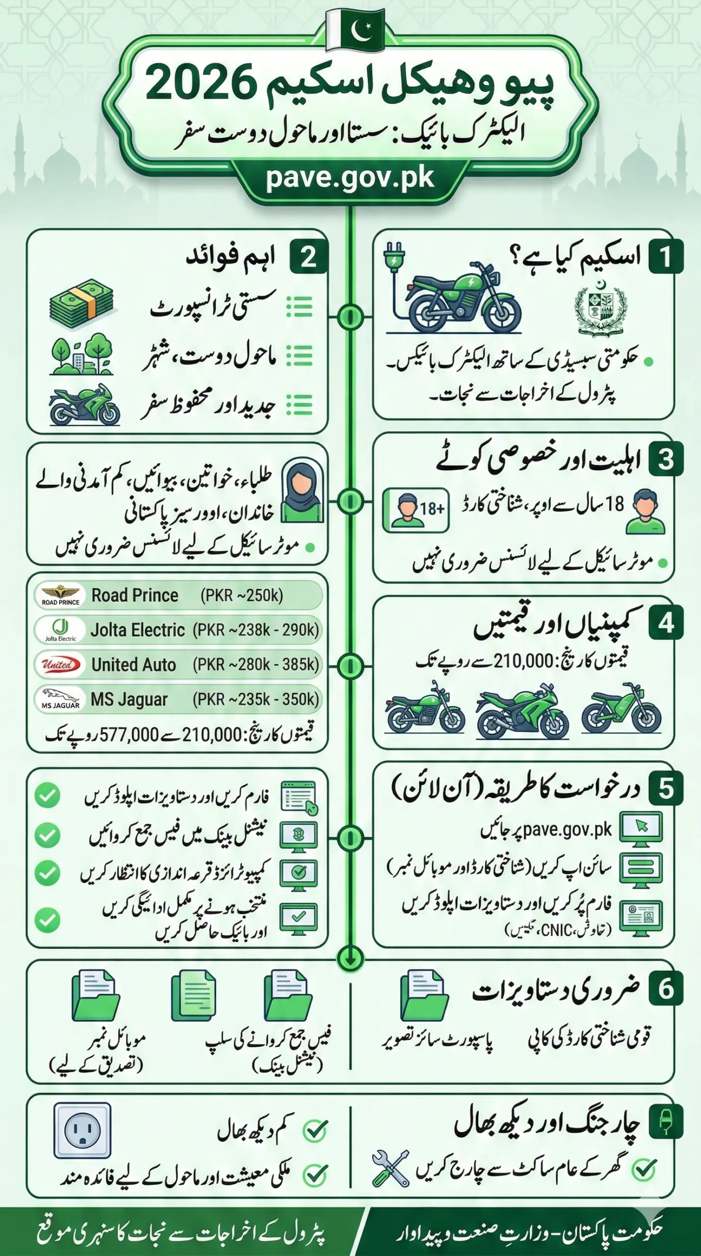 The Pakistan Accelerated Vehicle Electrification (PAVE) scheme is a government-backed plan to promote electric mobility in the country. Under this program, people can apply online at pave.gov.pk to purchase electric bikes at subsidized prices.