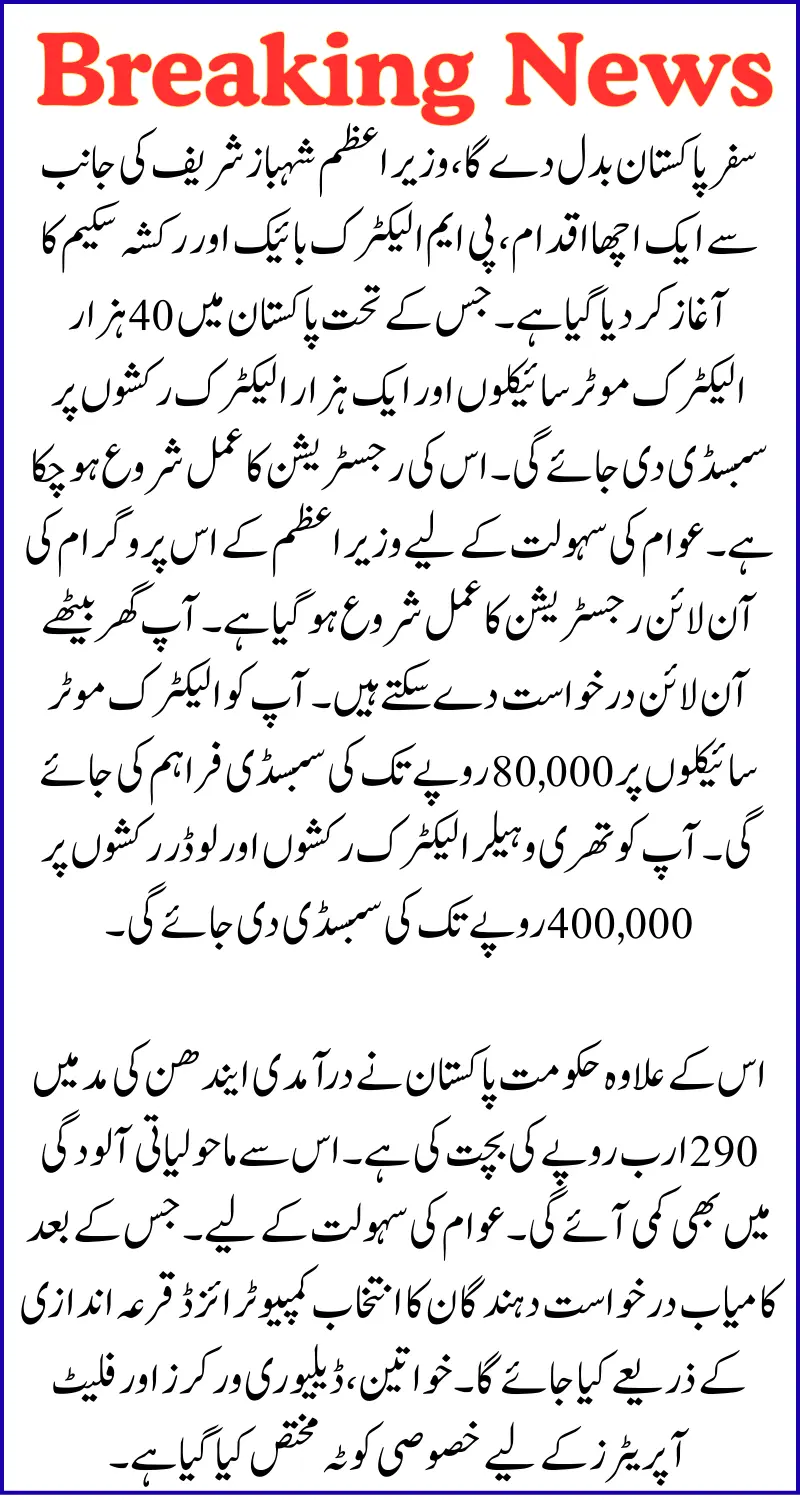Travel will change Pakistan, a good initiative has been launched by Prime Minister Shahbaz Sharif, the PM Electric Bike and Rickshaw Scheme. Under which subsidy will be given on 40,000 electric motorcycles and 1,000 electric rickshaws in Pakistan. Its registration process has started. For the convenience of the public, the online registration process of this Prime Minister’s program has started. You can apply online from home. You will be provided with a subsidy of up to Rs 80,000 on electric motorcycles. You will be given a subsidy of up to Rs 400,000 on three-wheeler electric rickshaws and loader rickshaws.