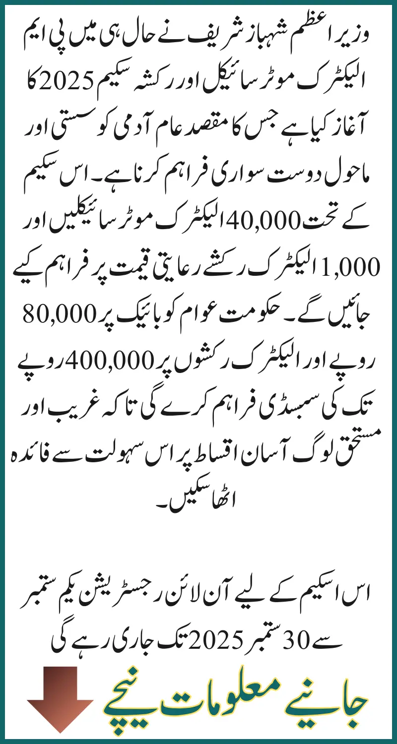 Online registration for this scheme will continue from September 1 to September 30, 2025, while the selection of successful candidates will be done through a computerized draw on October 1. The scheme has a special quota for women, delivery riders and fleet operators. Moreover, easy loans of up to Rs 200,000 for bikes and up to Rs 880,000 for rickshaws will be provided on installments so that maximum people can benefit from this opportunity.