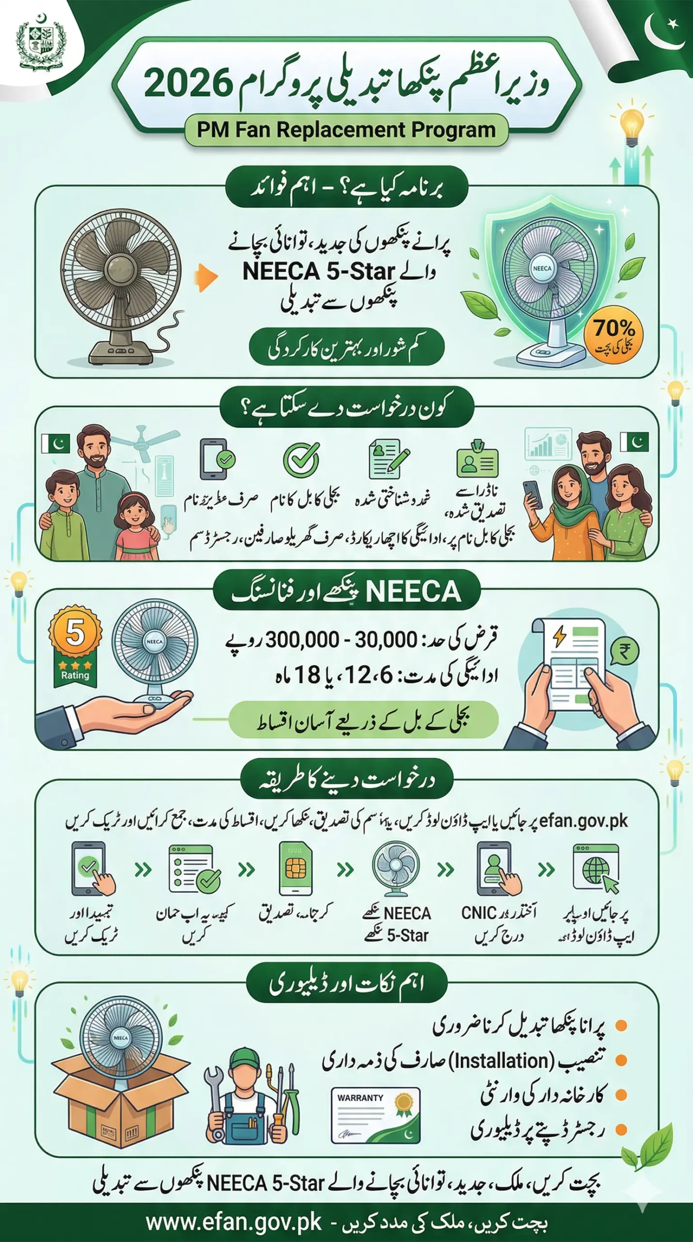 The PM Fan Replacement Program 2026 is a landmark initiative that makes energy-efficient fans affordable for every household in Pakistan. By applying through efan.gov.pk, families can easily replace their old fans, enjoy reduced electricity bills and contribute to a stronger national grid.