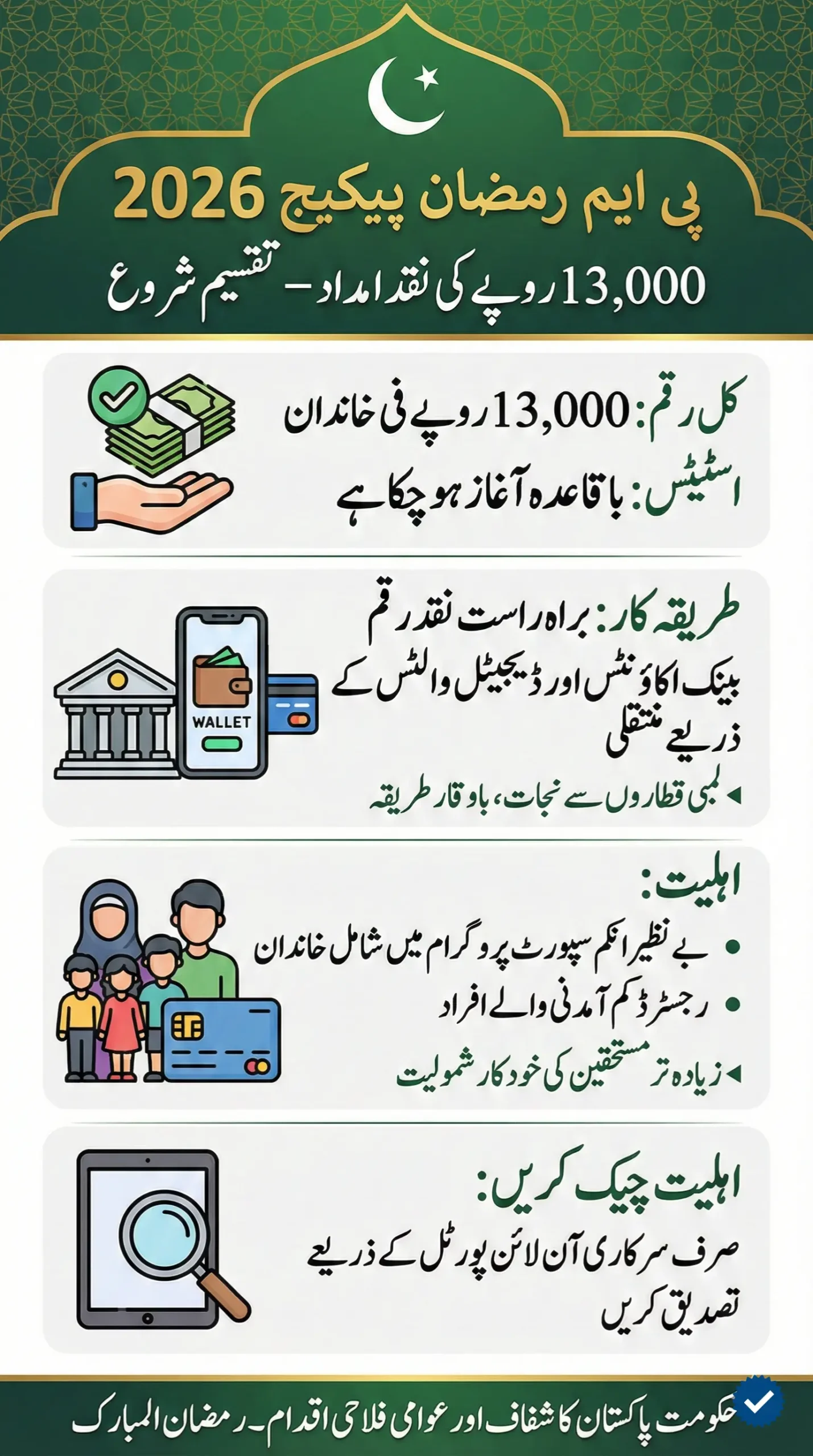 Each eligible family receives Rs 13,000 cash assistance under the Prime Minister’s Ramadan Relief Package 2026.