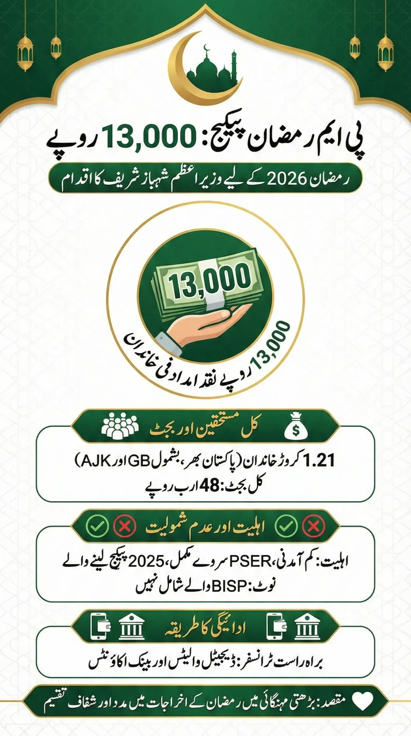 Prime Minister Shehbaz Sharif has launched the PM Ramzan Package 13000 for Ramadan 2026, offering Rs 13,000 cash aid to 12.1 million poor and deserving families across Pakistan, including Gilgit-Baltistan and Azad Kashmir. The relief will be transferred directly to beneficiaries through digital wallets and bank accounts to ensure transparency and quick delivery.