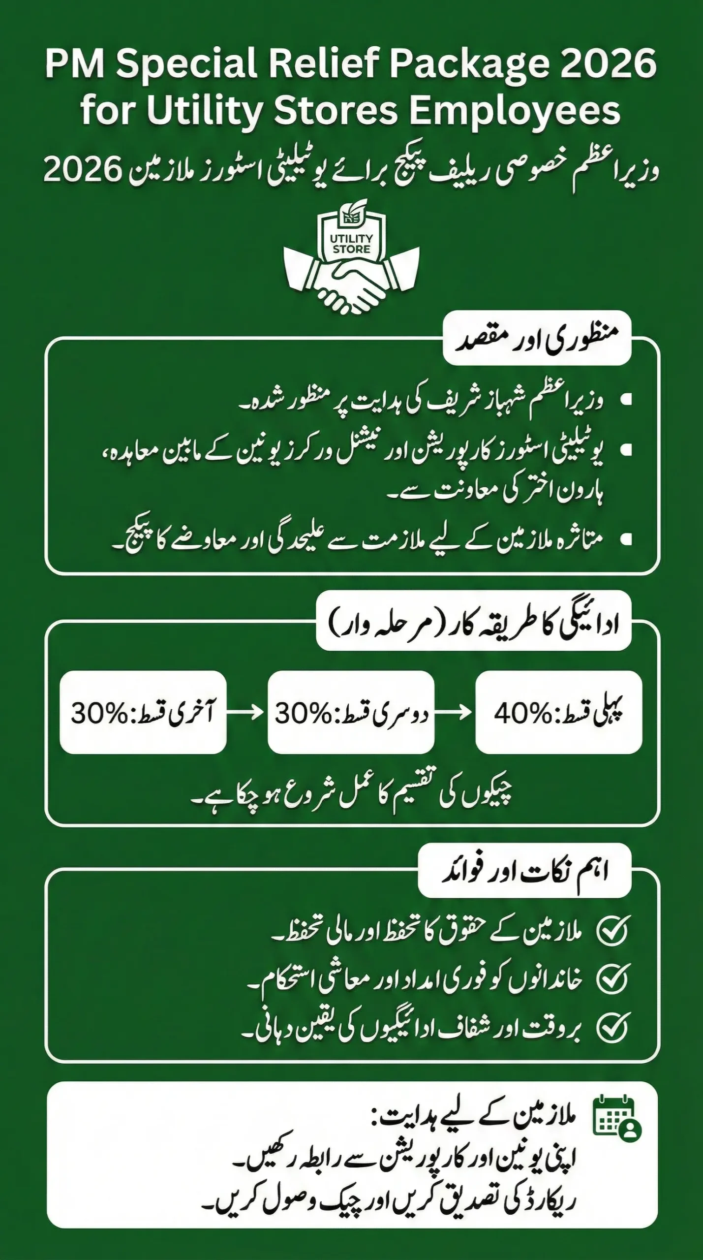 Good news for Utility Stores employees in 2026 as the PM Special Relief Package has been officially approved on the instructions of Prime Minister Shahbaz Sharif. The decision was finalized after a formal agreement between the Utility Stores Corporation and the National Workers Union, facilitated by Special Assistant Haroon Akhtar.