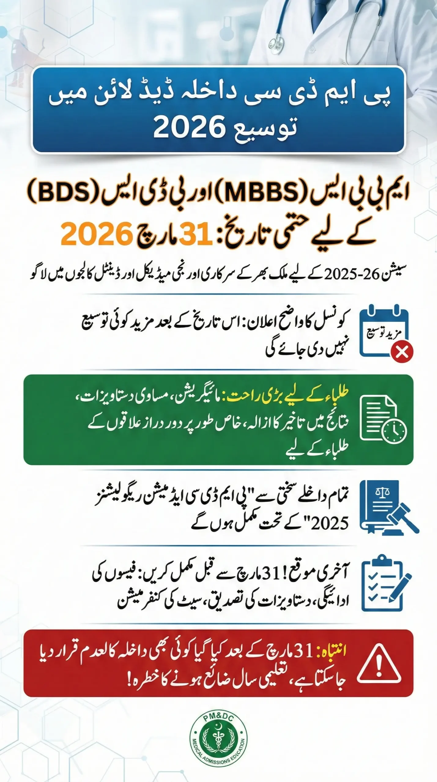 The PMDC Admissions Deadline Extended 2026 is a crucial opportunity for thousands of students chasing their MBBS and BDS dreams. But PM&DC has drawn a clear line: March 31, 2026 is the final date.