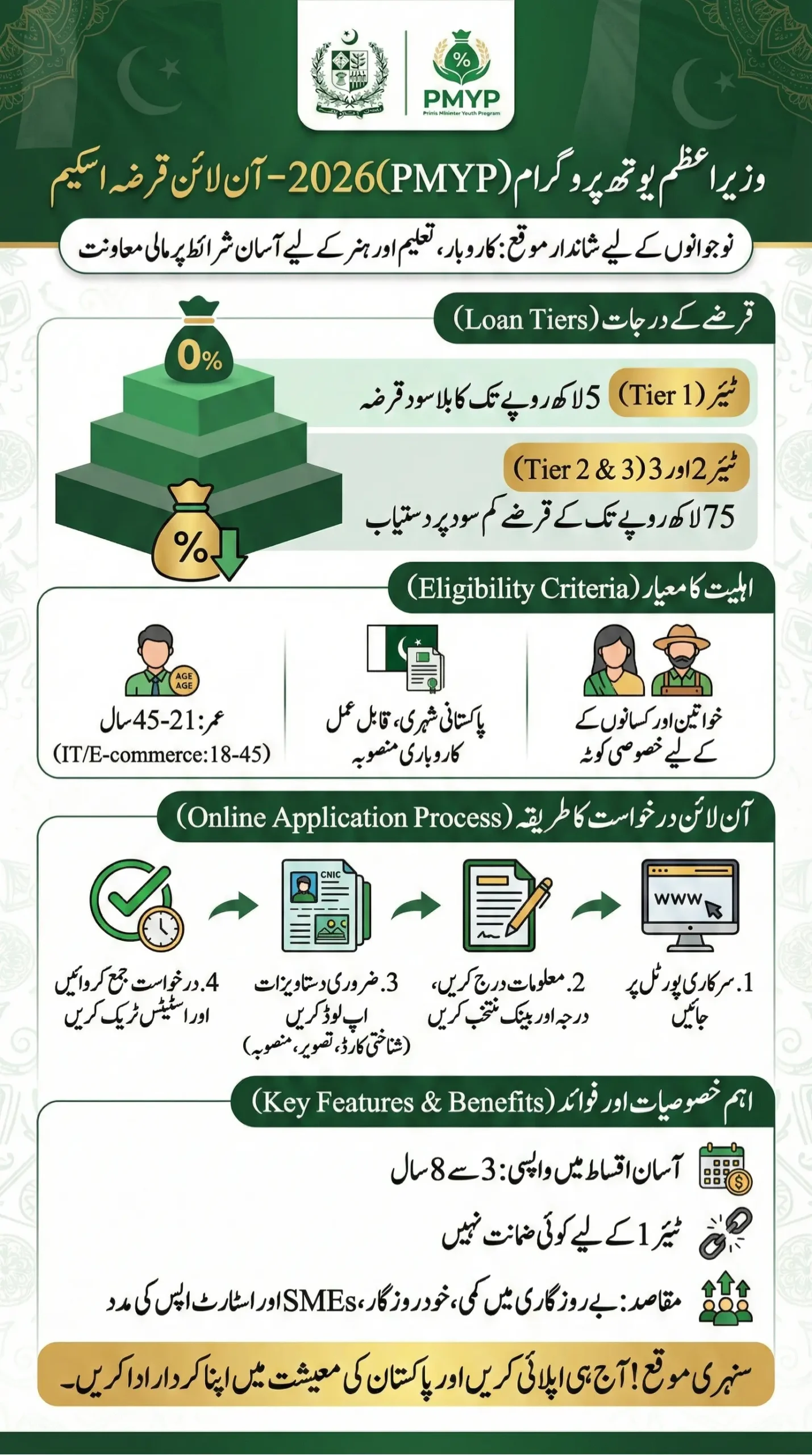 The Prime Minister Youth Program (PMYP) is a flagship initiative designed to provide financial assistance to young Pakistanis who have the potential to start or grow their businesses. The 2026 scheme includes three loan tiers, from interest-free microloans to large-scale financing, ensuring that both small startups and established enterprises can benefit.