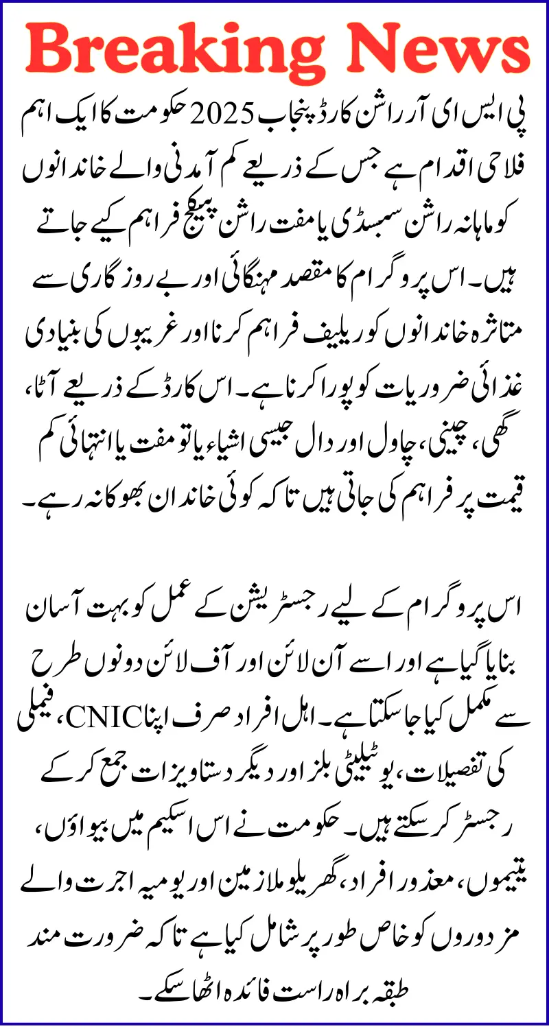 PSER Ration Card Punjab 2025 is an important welfare initiative of the government through which monthly ration subsidy or free ration packages are provided to low-income families. The aim of this program is to provide relief to families affected by inflation and unemployment and to meet the basic food needs of the poor. Through this card, items like flour, ghee, sugar, rice and pulses are either provided free of cost or at a very low price so that no family goes hungry.