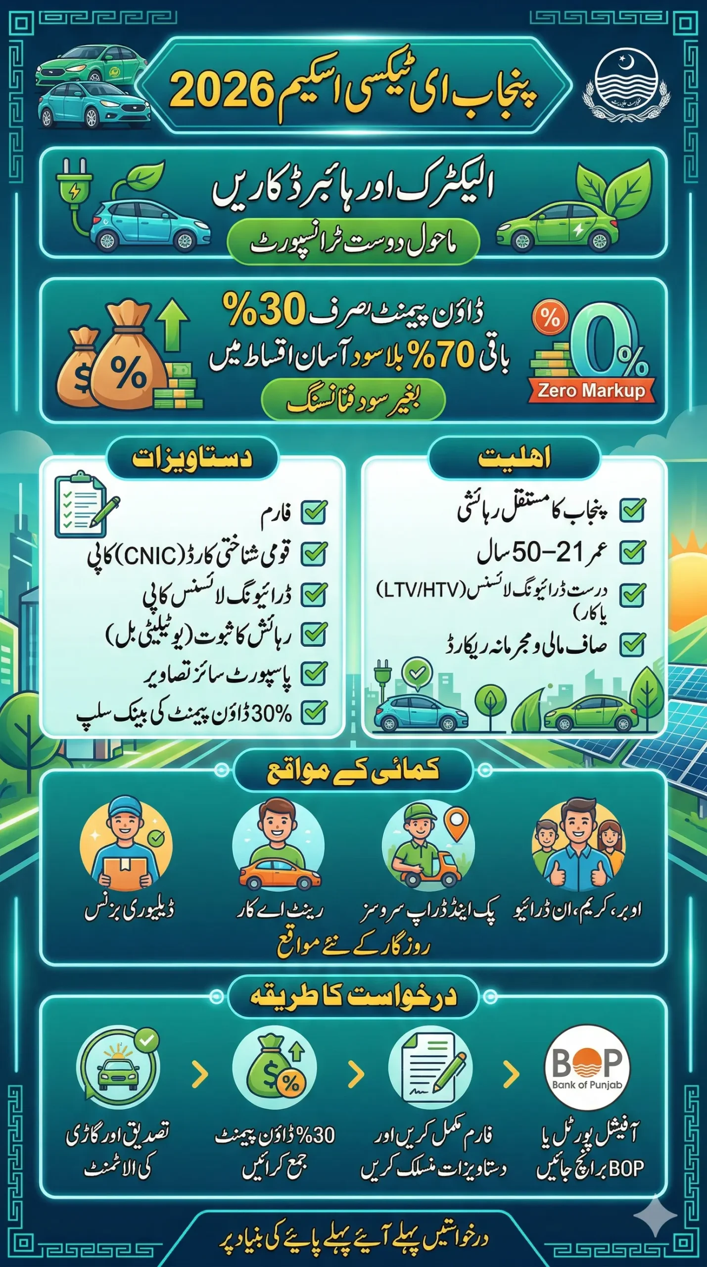 Punjab E-Taxi Scheme Details 2026 is a revolutionary project of the Punjab government under which citizens can own their own electric or hybrid car by paying only a 30% down payment. The remaining amount can be paid in easy installments without any interest. The scheme has been launched in collaboration with the Bank of Punjab (BOP) and aims to provide employment to unemployed youth and also promote eco-friendly transport in the province.