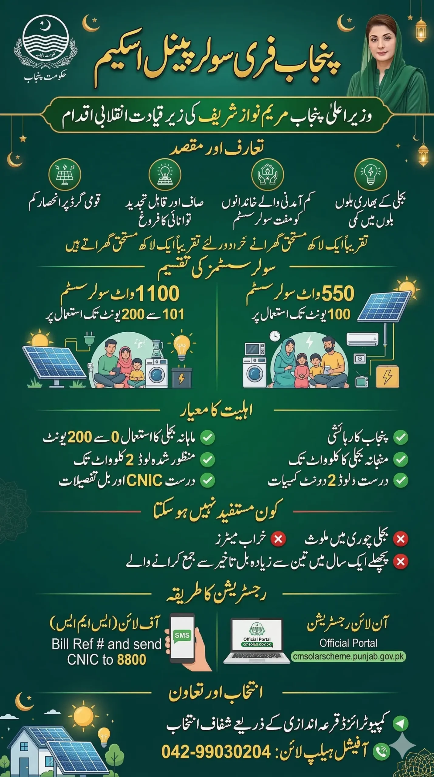 Applicants can register through the official portal cmsolarscheme.punjab.gov.pk or send their CNIC and electricity bill reference number to 8800 via SMS. After verification, beneficiaries will be selected through a transparent computerized lottery system. This initiative aims to support 100,000 families while promoting renewable energy across the province.