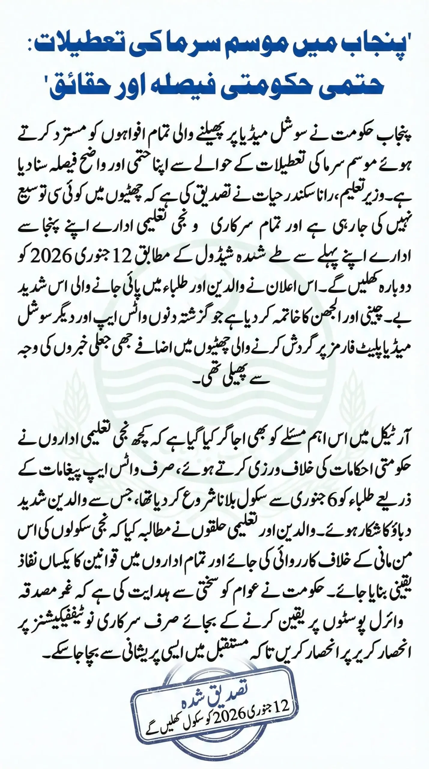 After days of confusion and online noise, the Punjab government’s message is now loud and clear. There is no extension in winter vacations, and all schools and colleges across the province will reopen on January 12, 2026. Social media rumors created unnecessary panic, but the official stance leaves no space for doubt.