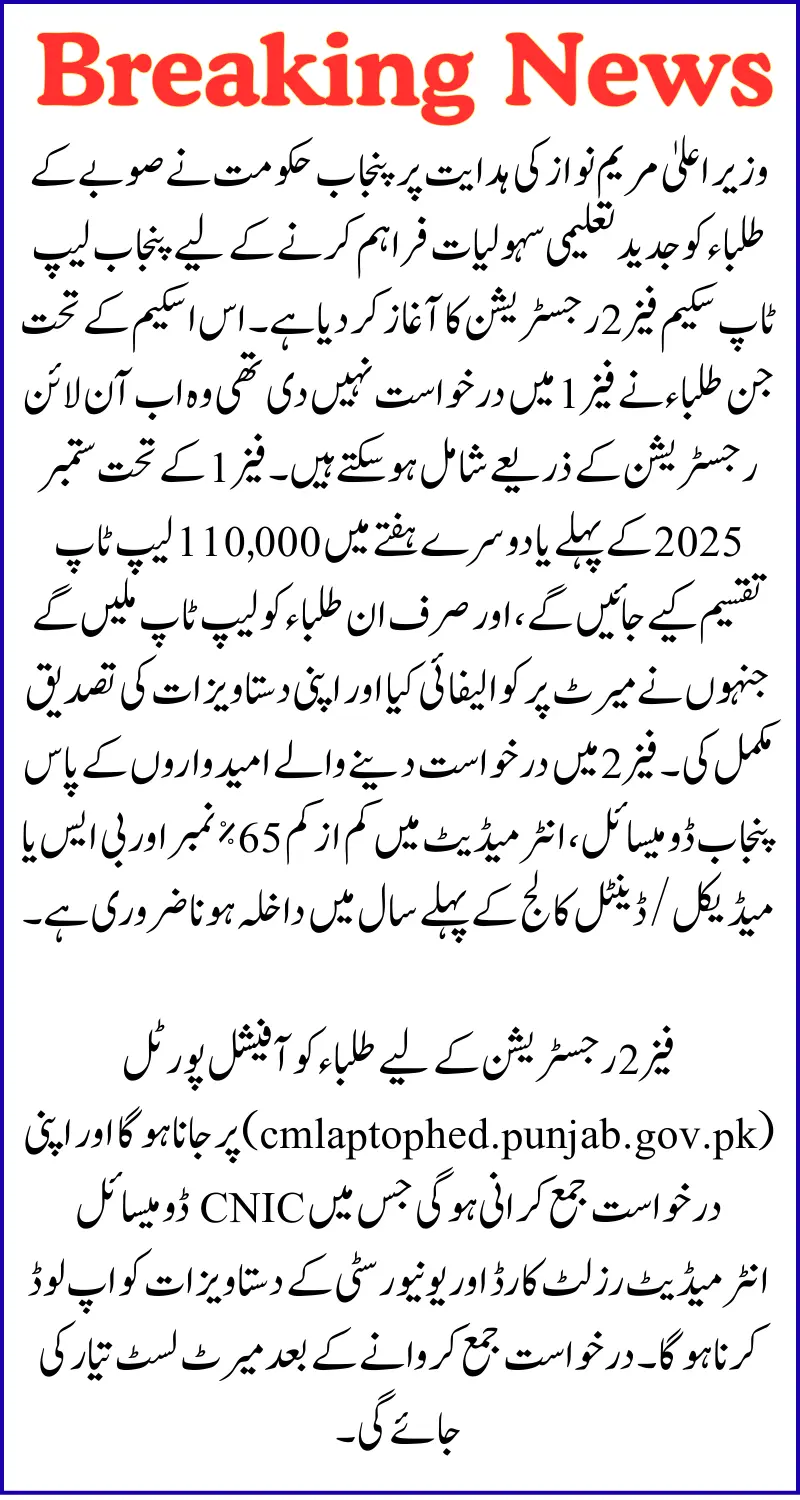 Candidates applying in Phase 2 must have Punjab domicile, at least 65% marks in Intermediate and admission in the first year of BS or Medical/Dental College. For Phase 2 registration students will have to go to the official portal (cmlaptophed.punjab.gov.pk) and submit their application in which CNIC domicile Intermediate result card and university documents must be uploaded.