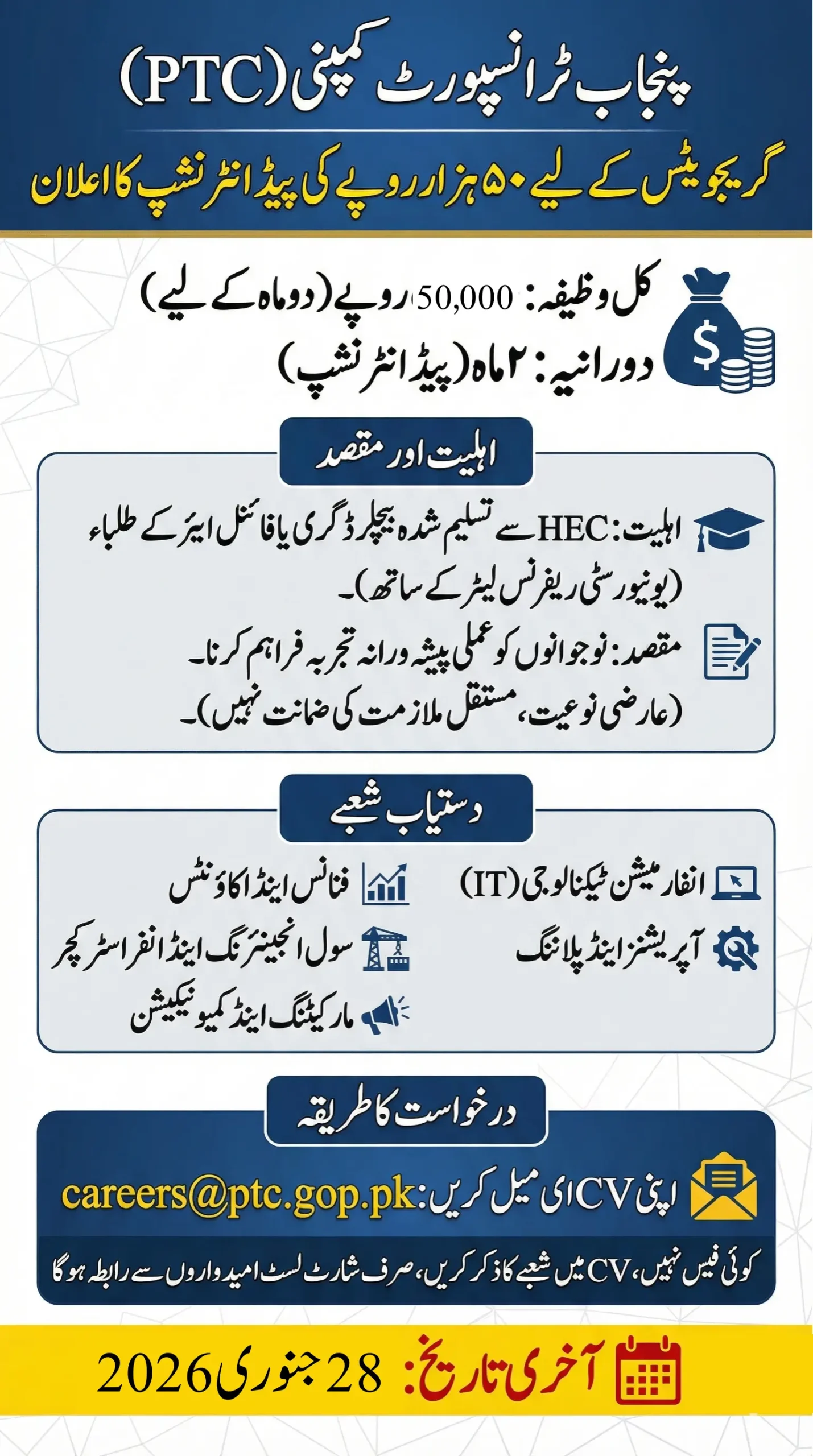 Applicants must hold a Bachelor’s degree from an HEC-recognized institution, while students can apply with a university reference letter. The stipend is Rs 50,000, though the internship does not guarantee permanent employment. Interested candidates must email their CV to careers@ptc.gop.pk. The deadline to apply is January 28, 2026, and only shortlisted applicants will be contacted.