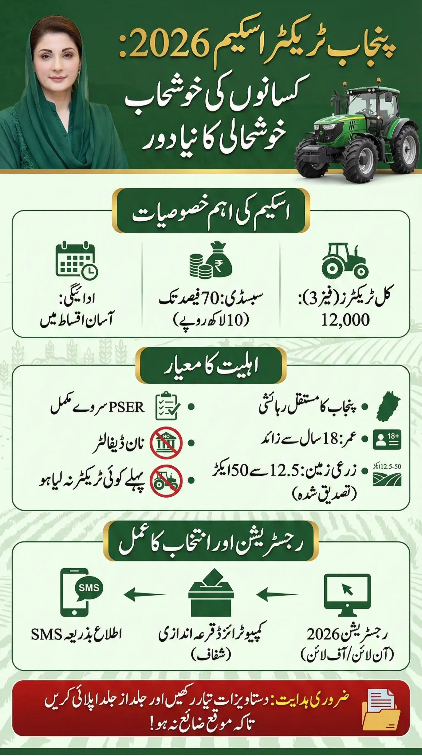 Punjab Tractor Scheme 2026 is an excellent scheme to provide modern tractors to farmers at low cost. Under Punjab Tractor Scheme 2026, tractors will be provided to farmers on subsidy and easy installments on the directions of Chief Minister Maryam Nawaz Sharif to increase agricultural production and reduce the difficulties of farmers. The aim of this scheme is to provide farmers with access to modern agricultural machinery, which will not only save labor and time in the fields but will also enable development in the agriculture sector.