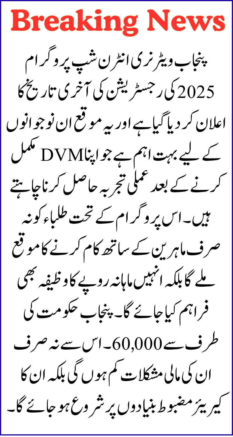 The Punjab Veterinary Internship Program 2025 registration deadline has been announced and this opportunity is very important for those youth who want to gain practical experience after completing their DVM. Under this program, students will not only get the opportunity to work with experts but will also be provided with a monthly stipend of Rs. 60,000 by the Punjab government. This will not only reduce their financial difficulties but will also start their career on a strong footing.