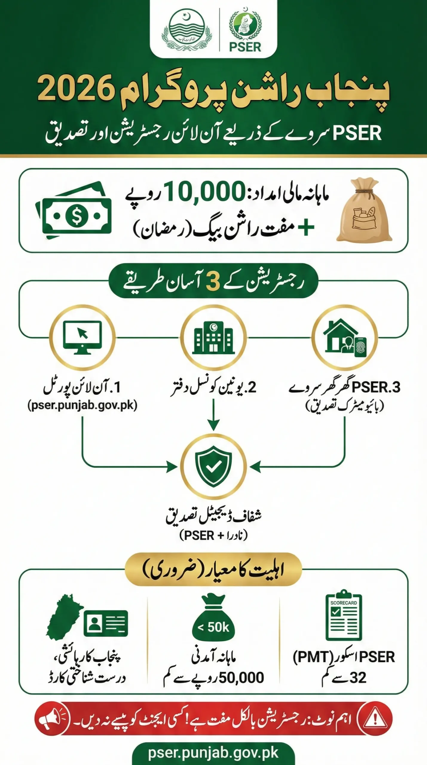 The Rashan Program 2026 Online Registration is now open through the PSER survey system, allowing Punjab families to apply from home without visiting government offices. The government has made the process fully digital, transparent, and fast, with CNIC-based verification through NADRA and PSER. Eligible households can receive Rs. 10,000 cash assistance along with a free ration bag during Ramzan.