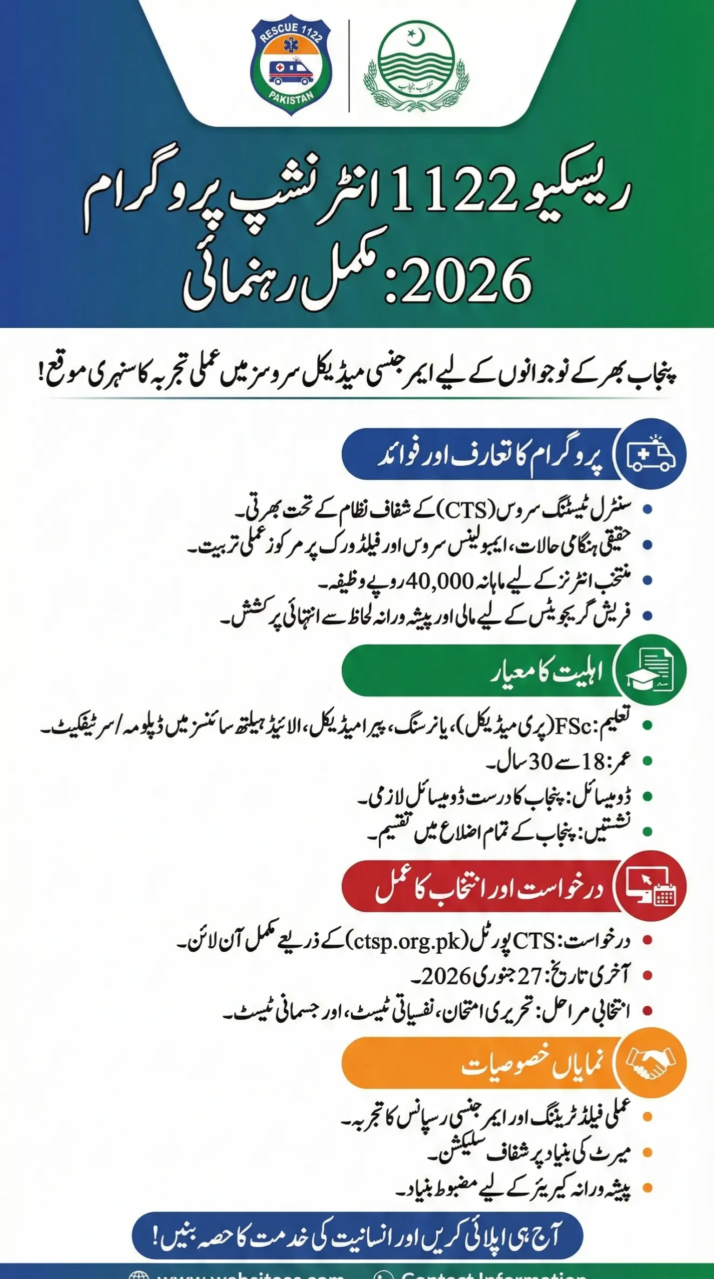 Rescue 1122 Internship 2026 offers a golden opportunity for young candidates in Punjab to enter emergency medical services through a transparent CTS-based recruitment system. This guide explains online application via the CTS portal, eligibility criteria, age limit, district-wise seat allocation, and the full selection process.