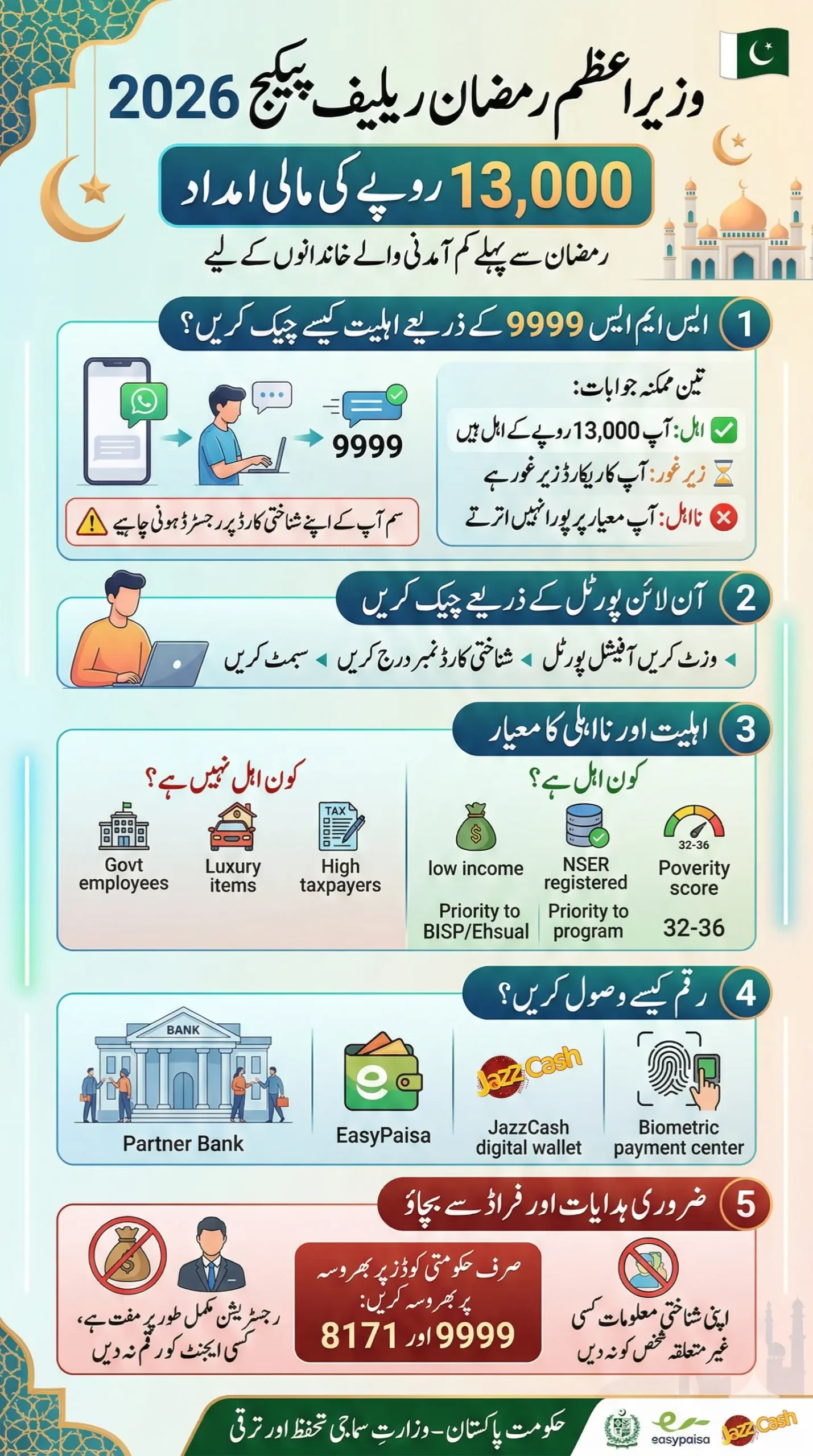 The Wazir e Azam Ramzan Package 2026 offers Rs 13,000 cash assistance to low-income families across Pakistan before Ramzan. Eligible citizens can easily check their status by sending their 13-digit CNIC number to 9999 via SMS or through the official online portal. The program targets NSER-registered households, including BISP and Ehsaas beneficiaries, while government employees and high-income taxpayers are excluded.